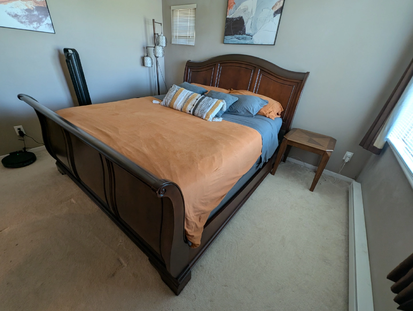 70Selling a king-size bed frame with a dark wood finish with a Sterns & Foster king mattress and box springs! It's in good condition and would look great in any bedroom. If you're interested, feel free to message me! $600 OBO