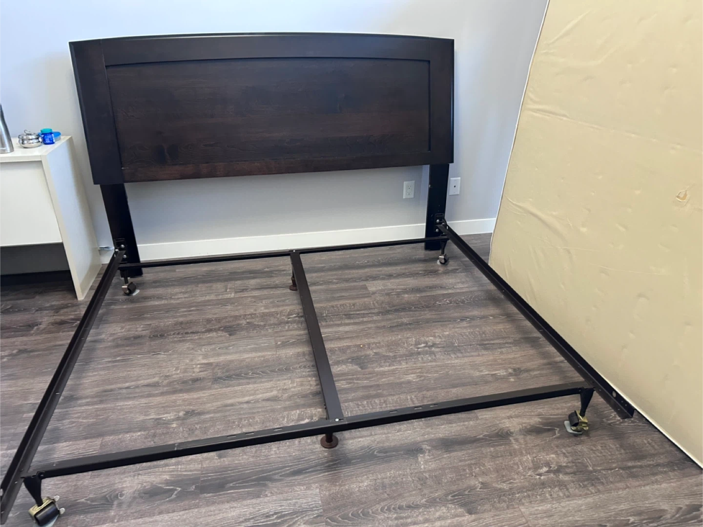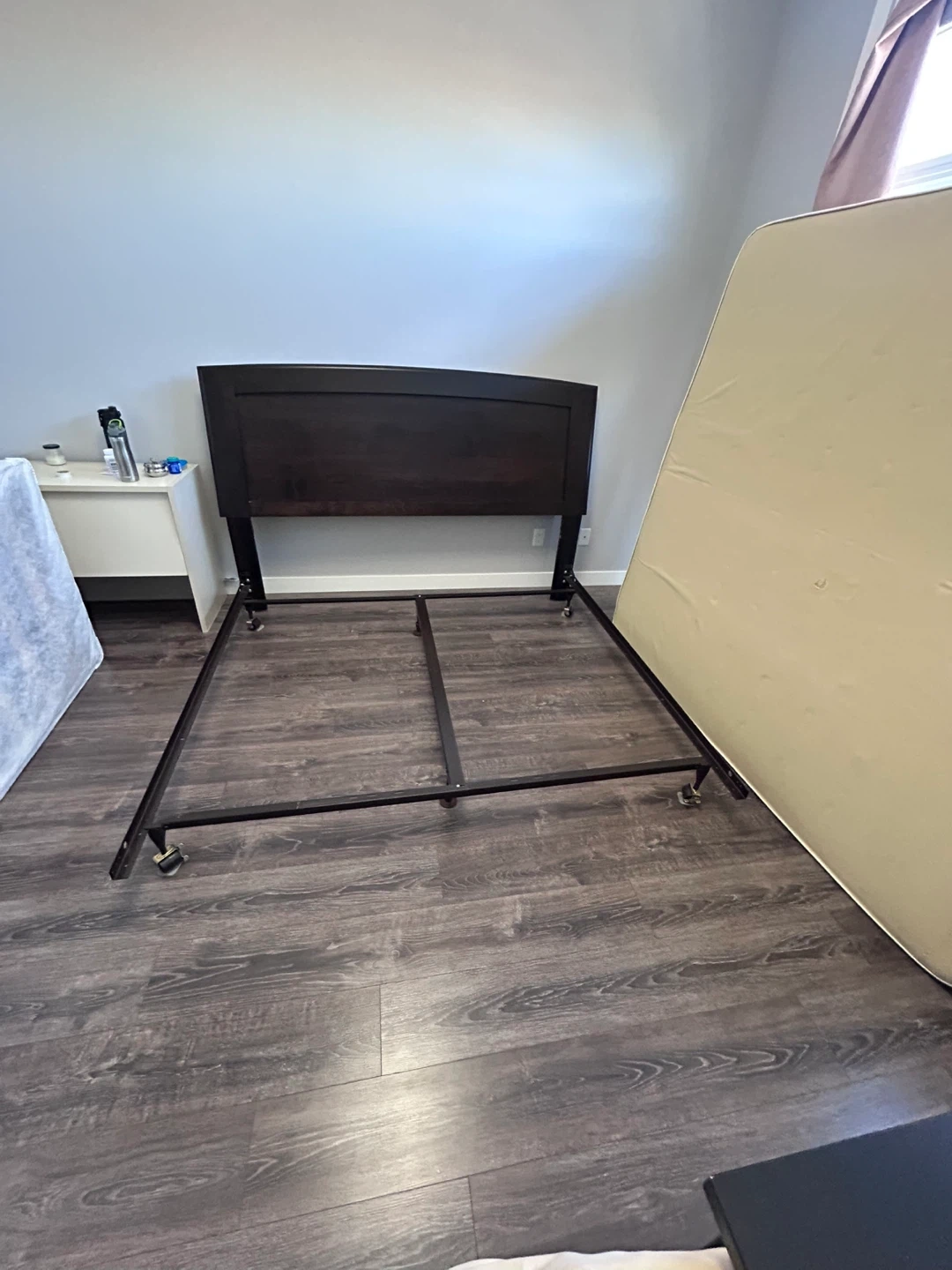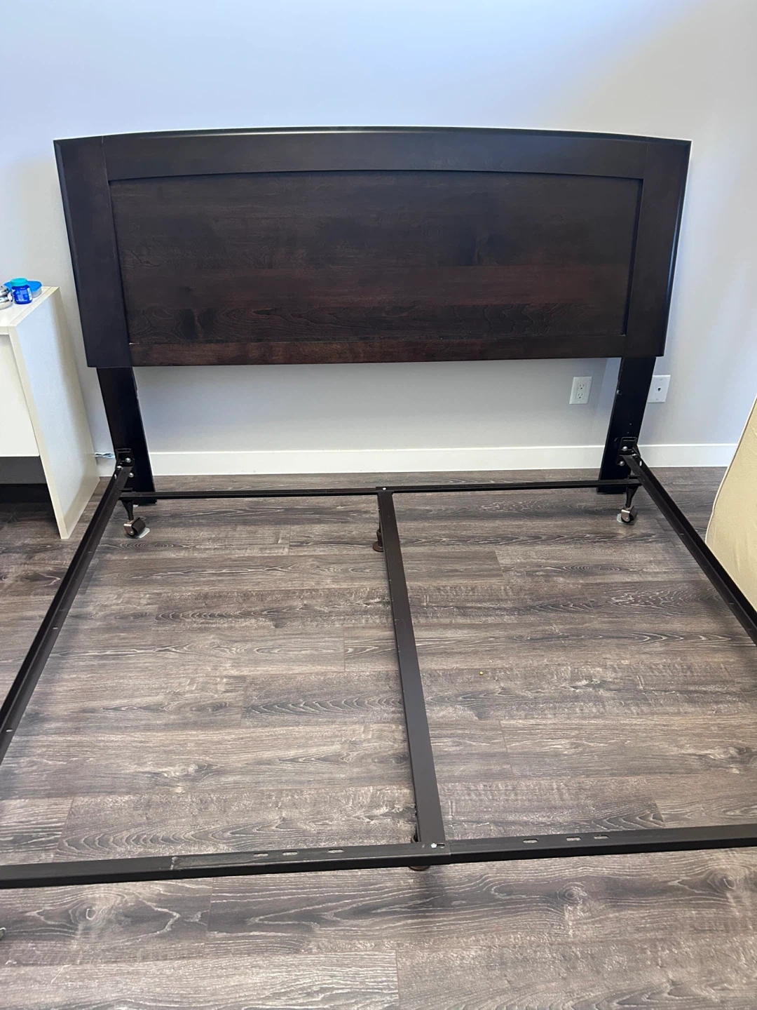 70Selling a sturdy king size dark wood bed frame complete with a headboard. It's in great shape and ready for a new home. It has a simple, elegant design that would fit well in any bedroom. Easy to assemble and disassemble for moving