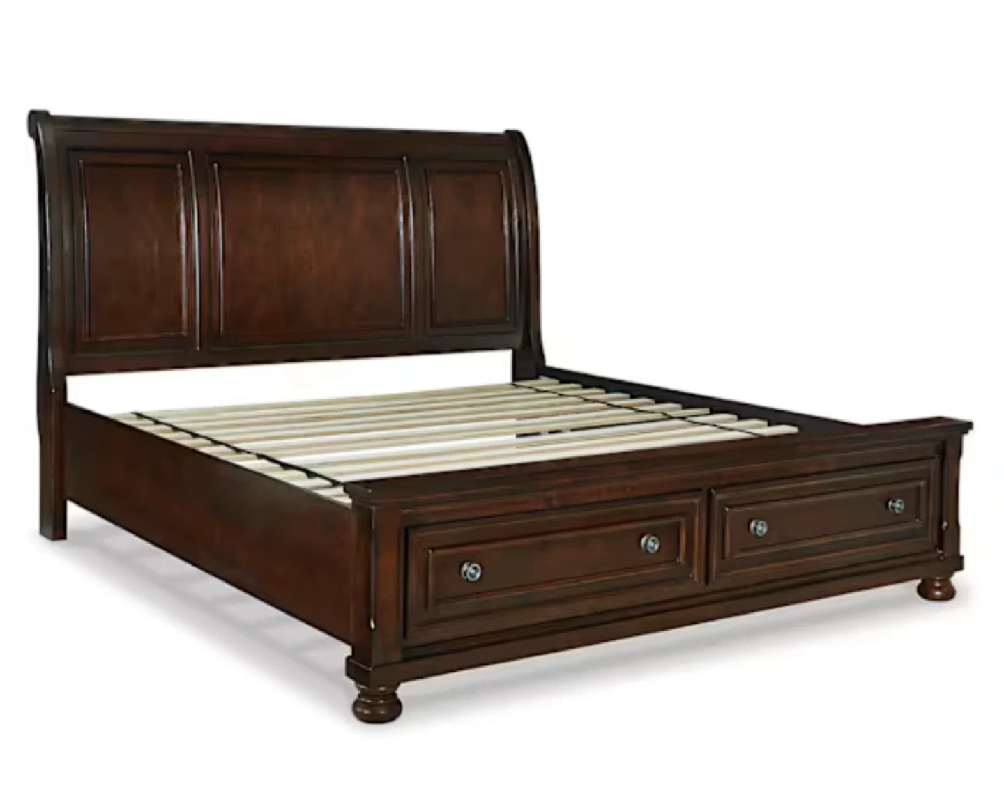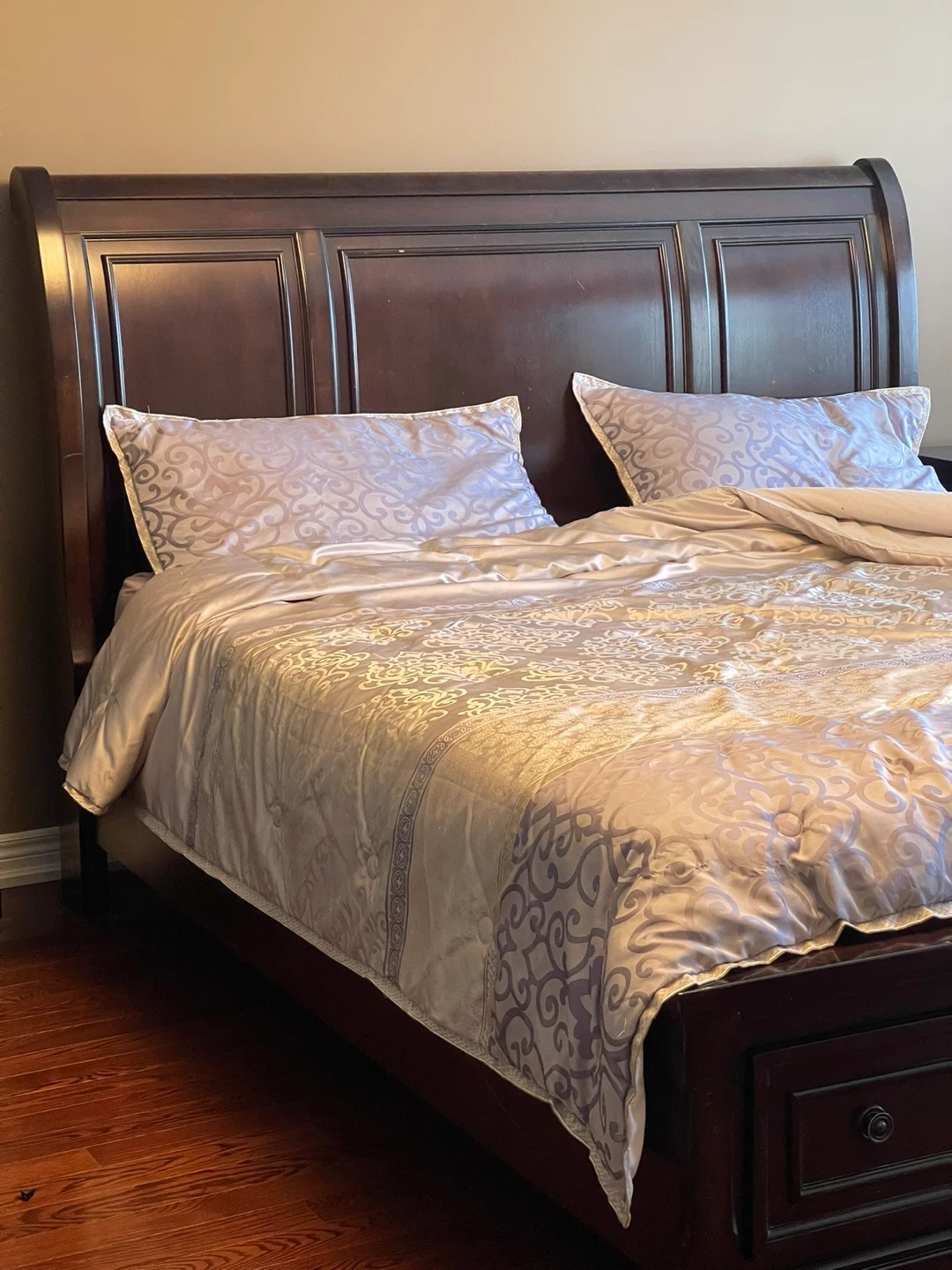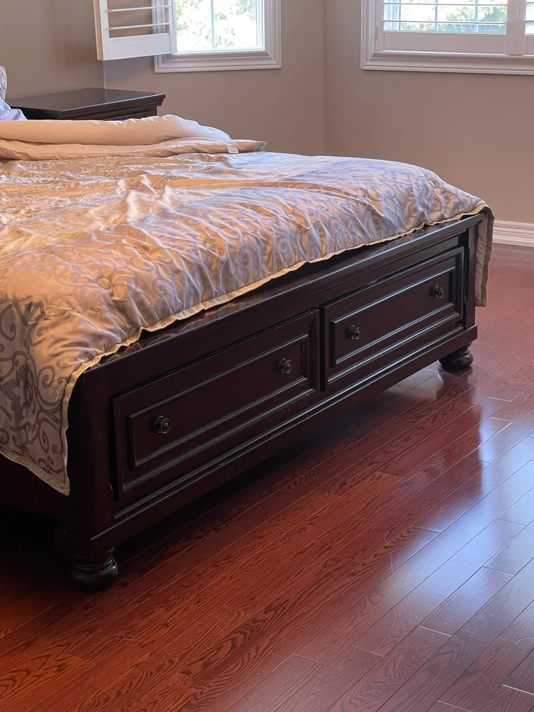 Selling a Ashley’s king size bed frame in dark wood. It has a sleigh headboard design and built-in storage drawers at the foot of the bed. Perfect for adding some extra storage to your bedroom!