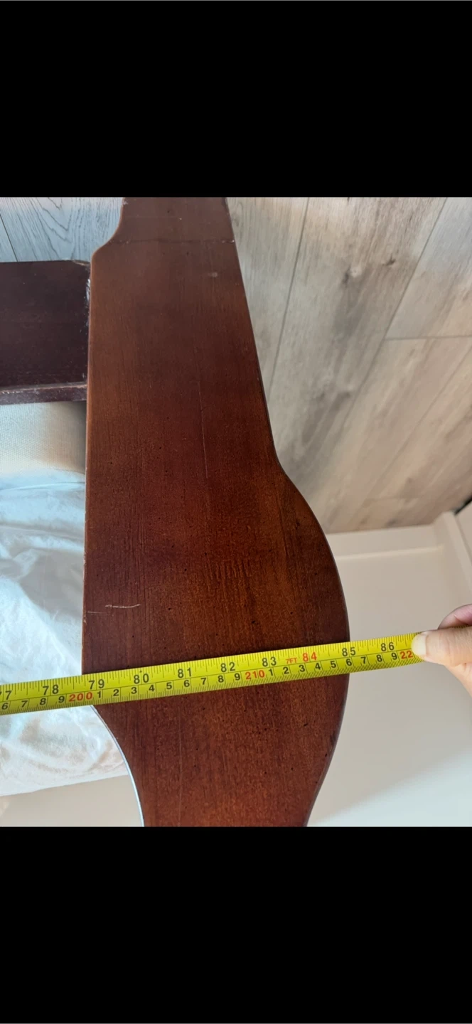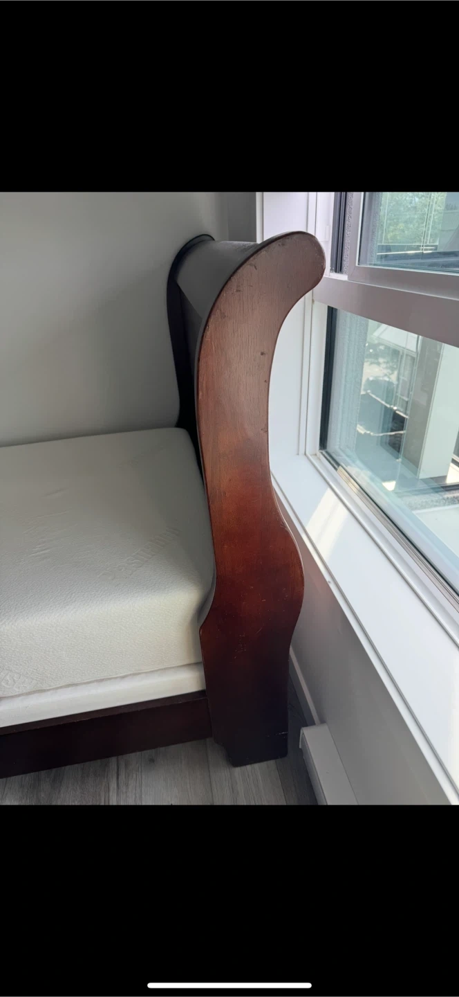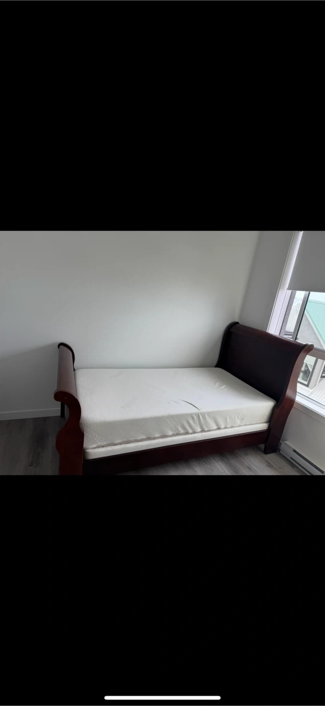 Selling a dark wood sleigh bed frame with PlasmaBed mattress. The PlasmaBed is great for quality sleep. The height of the headboard is approximately 42 inches, and the length of the frame is about 85 inches. It's a beautiful piece that would add a touch of elegance to any bedroom.