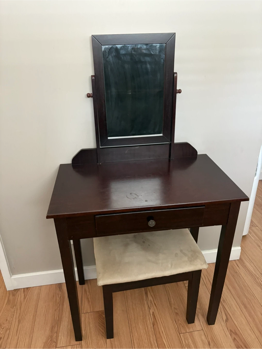 60Selling a lovely dark wood vanity table that comes with a mirror and a matching stool. It's a great addition to any bedroom or dressing area. The vanity features a drawer for storage and the stool is cushioned for comfort. Perfect for getting ready in the morning or for your evening routine!