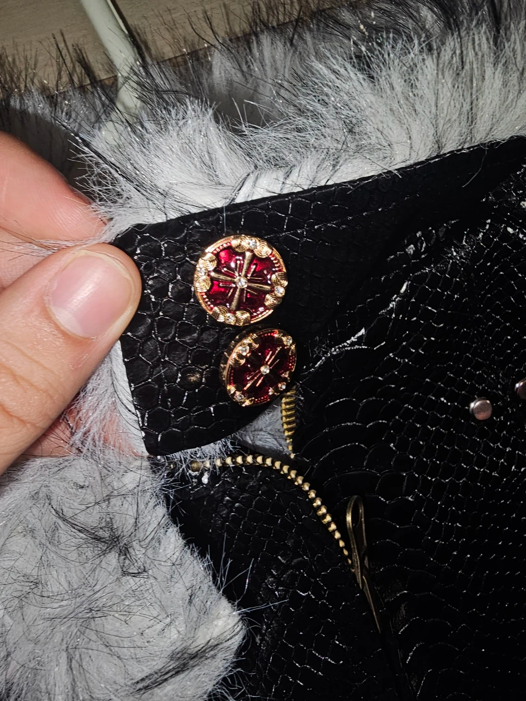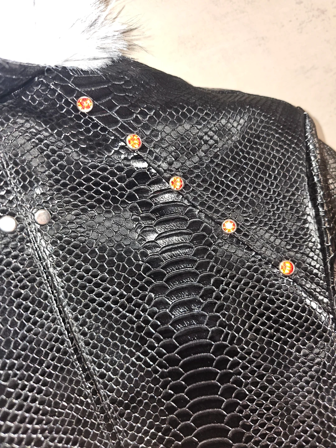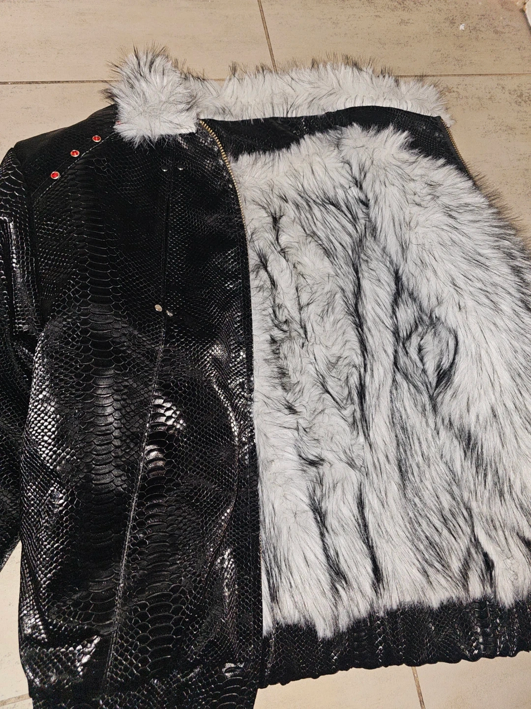 Black leather snakeskin bomber jacket. It features a faux fur collar and trim. Accented with gold jeweled buttons on the cuffs, collar, and shoulders. Fully lined for added warmth. Open to offers and trades.