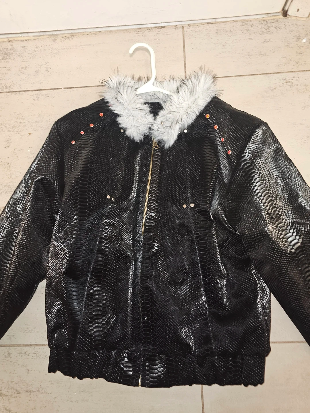 Black leather snakeskin bomber jacket. It features a faux fur collar and trim. Accented with gold jeweled buttons on the cuffs, collar, and shoulders. Fully lined for added warmth. Open to offers and trades.