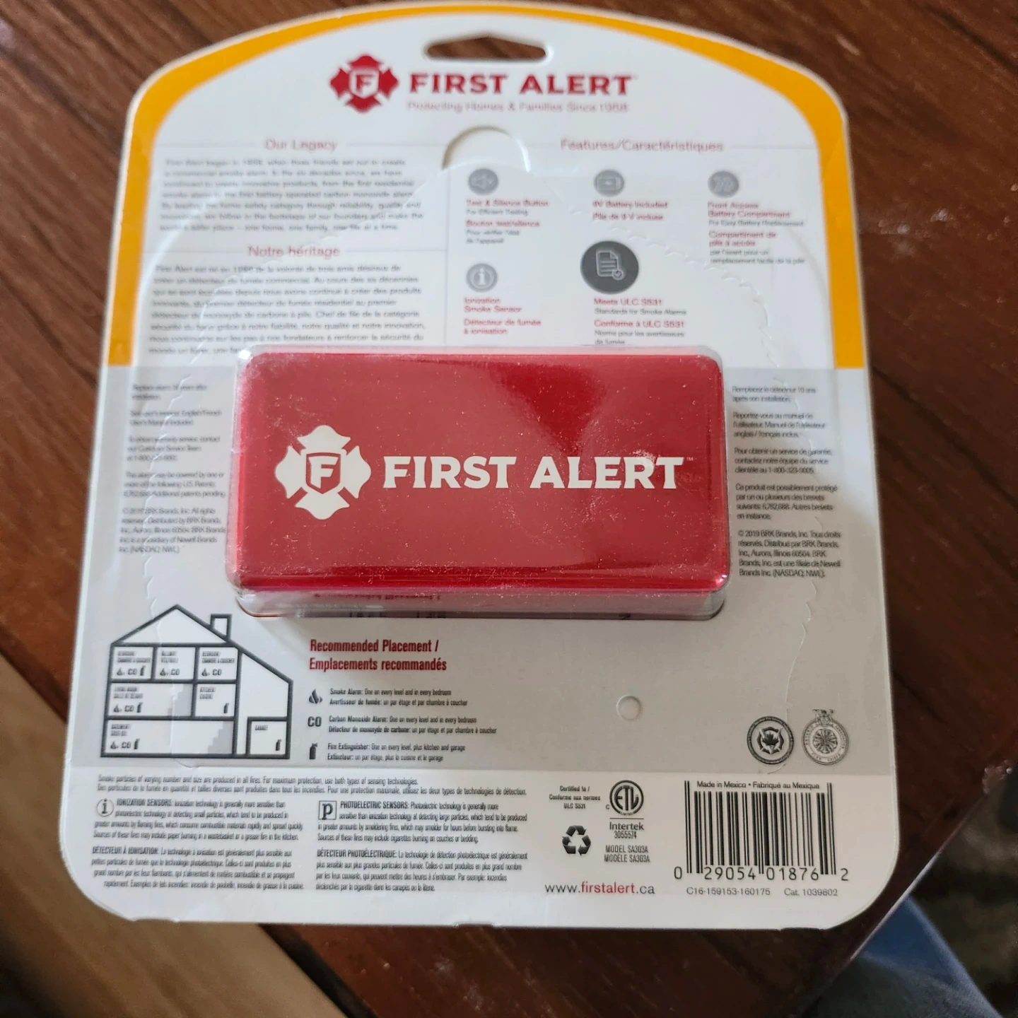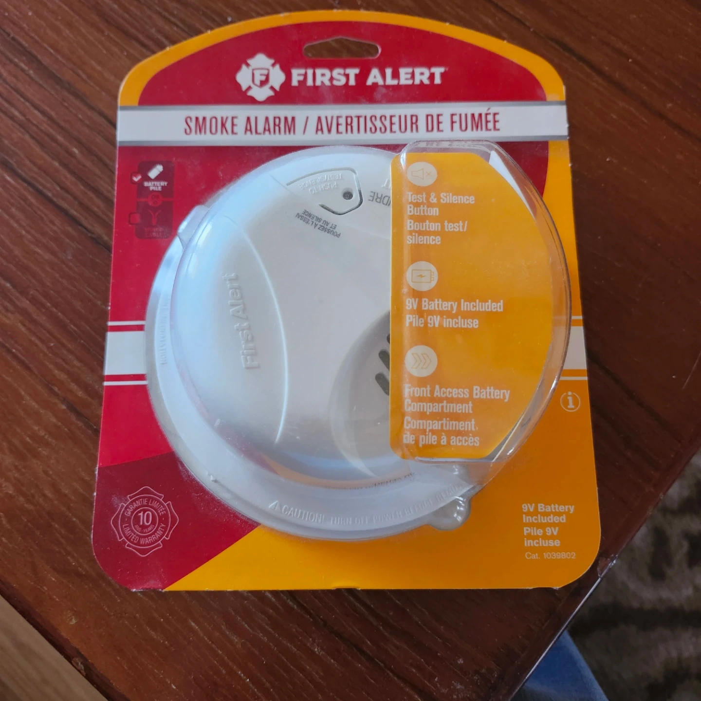 This is a new First Alert smoke alarm in its original packaging. It includes a 9V battery and features a test/silence button. The front access battery compartment makes it easy to change batteries. It's designed for home use and includes a 10-year limited warranty. I bought 1 too many and moving soon, buy new is $15.