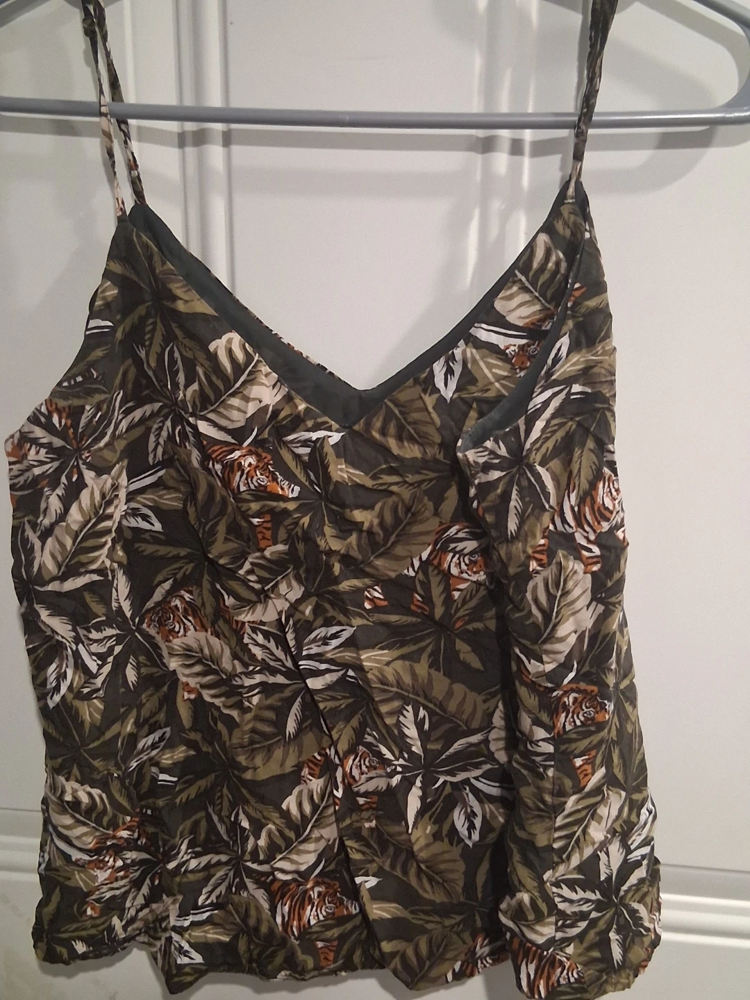 Cute camisole tank top with a bold tropical print featuring tigers and lush leaves. It has adjustable spaghetti straps and a flattering V-neckline. Lightweight fabric, perfect for warm weather!