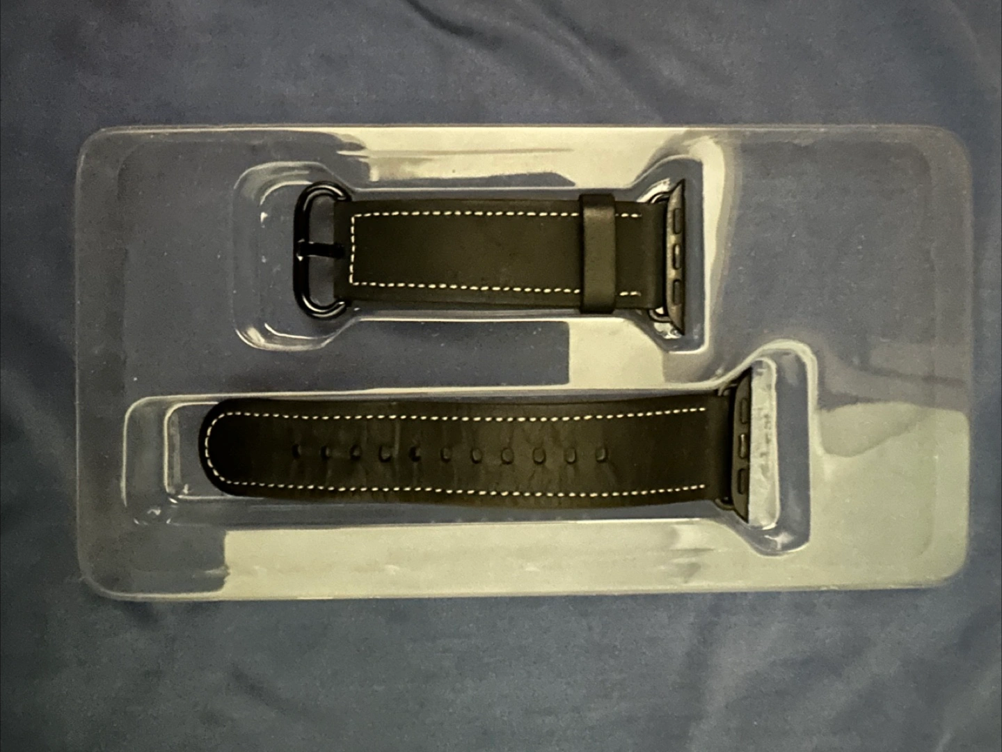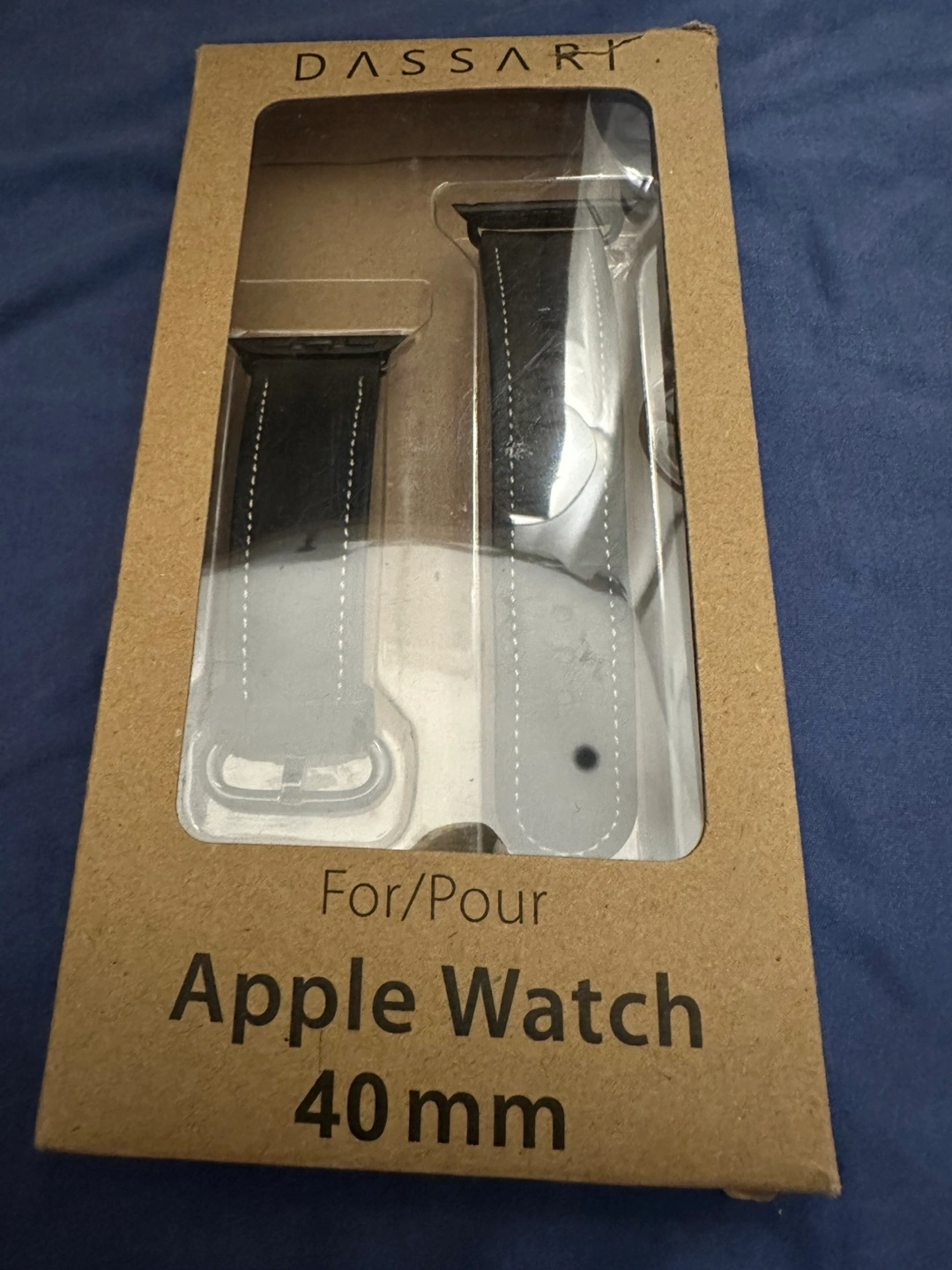 I'm selling a Dassari Apple Watch band, designed for 40mm Apple Watches. This band is crafted from premium genuine leather and features a sleek, black finish with contrasting white stitching for a stylish look. It's the perfect way to upgrade your Apple Watch. These bands typically retail for $60-$80. Treat your Apple watch to a sleek new band without breaking the bank!