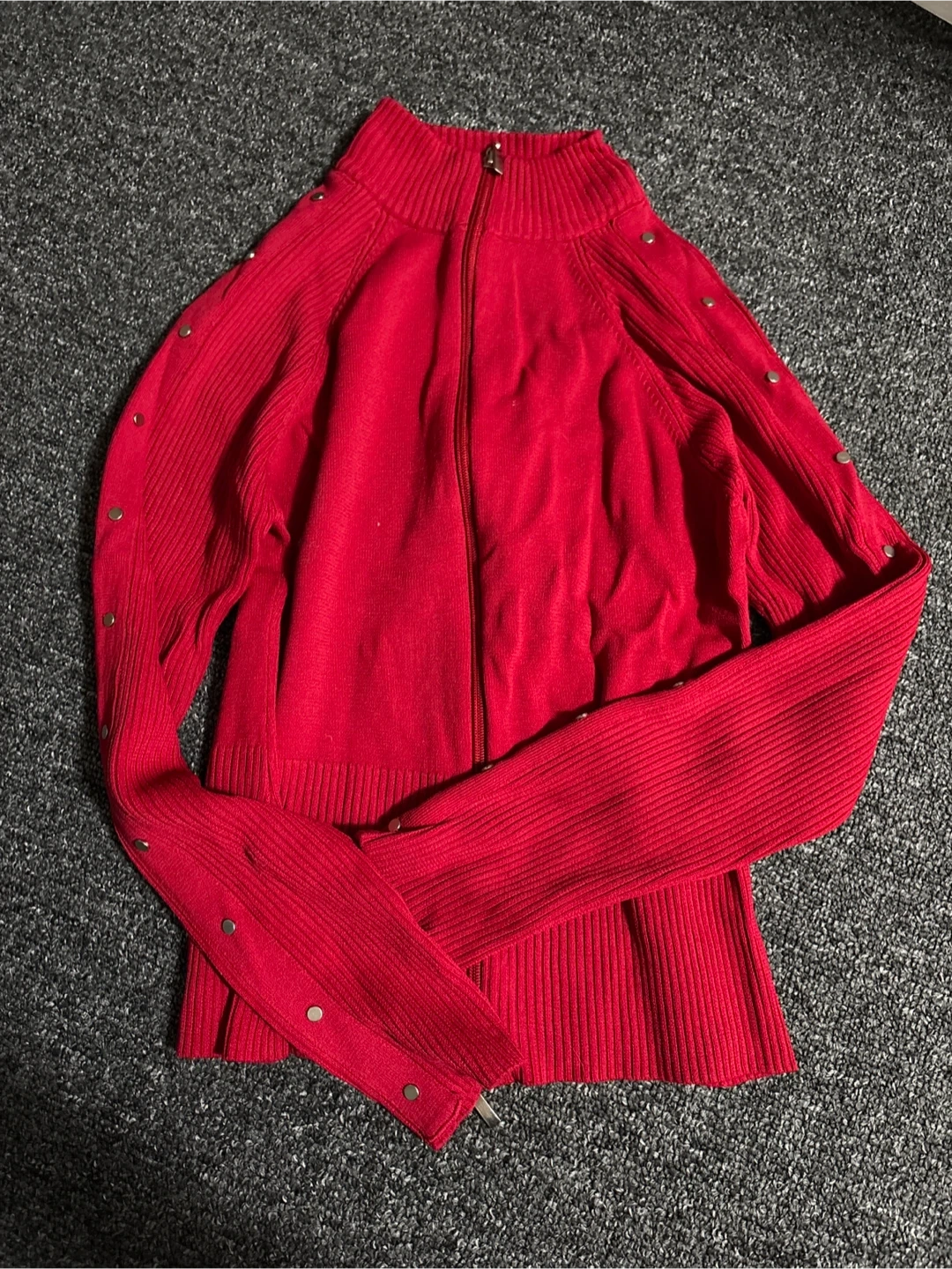Selling a red knit zip-up sweater. It features a ribbed design and button details along the sleeves. Perfect for layering or wearing on its own! Never worn!