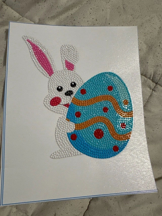 This handmade diamond painting card features an adorable Easter bunny hugging a beautifully decorated egg, perfect for adding a touch of spring to any space. The intricate detailing and vibrant colours make it a unique piece. It would be lovely to frame and hang up for Easter! As long as you see this ad, this little bunny is ready to hop into a new home.