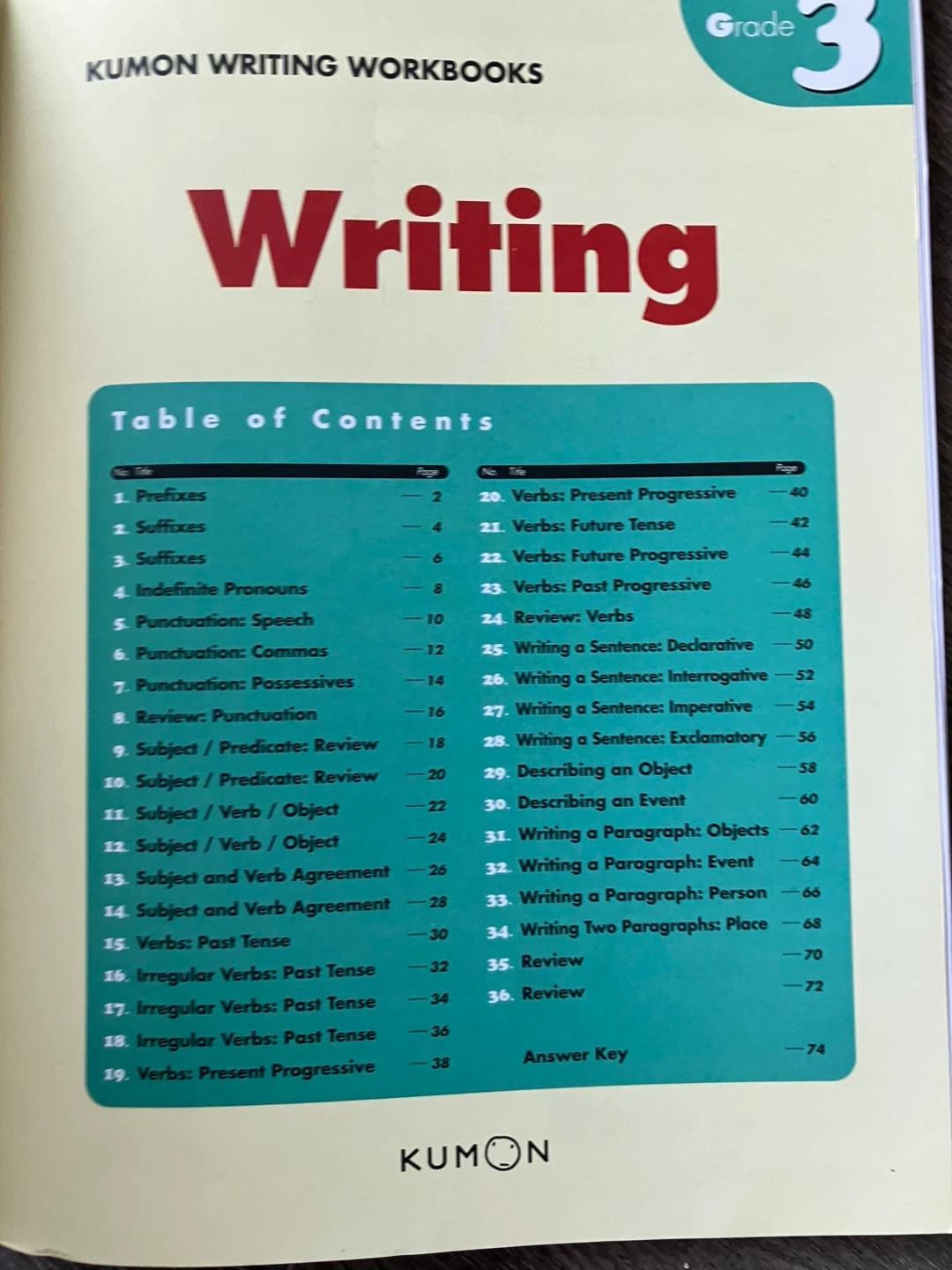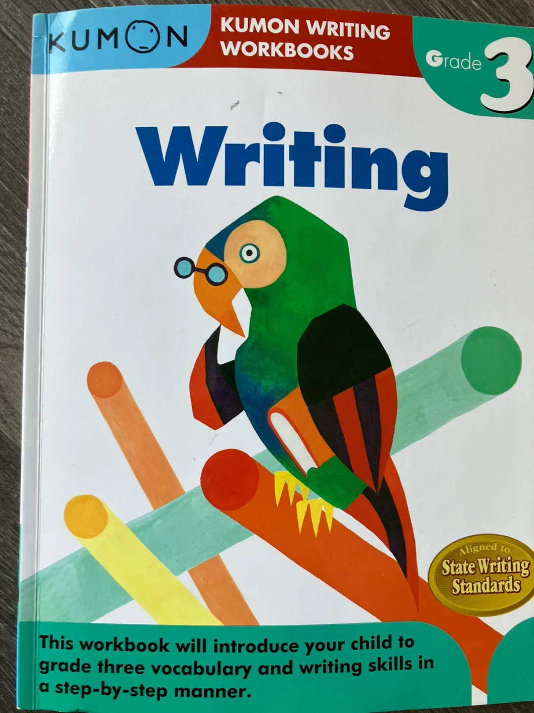 This Kumon workbook is designed for Grade 3 students to introduce vocabulary and writing skills. It covers topics like prefixes, suffixes, verbs, and sentence construction. It's aligned to State Writing Standards.