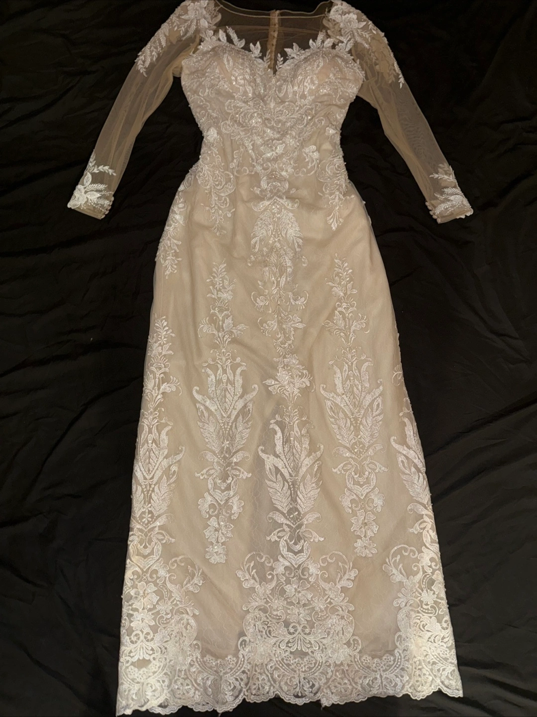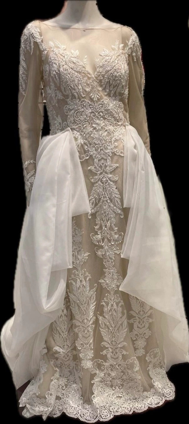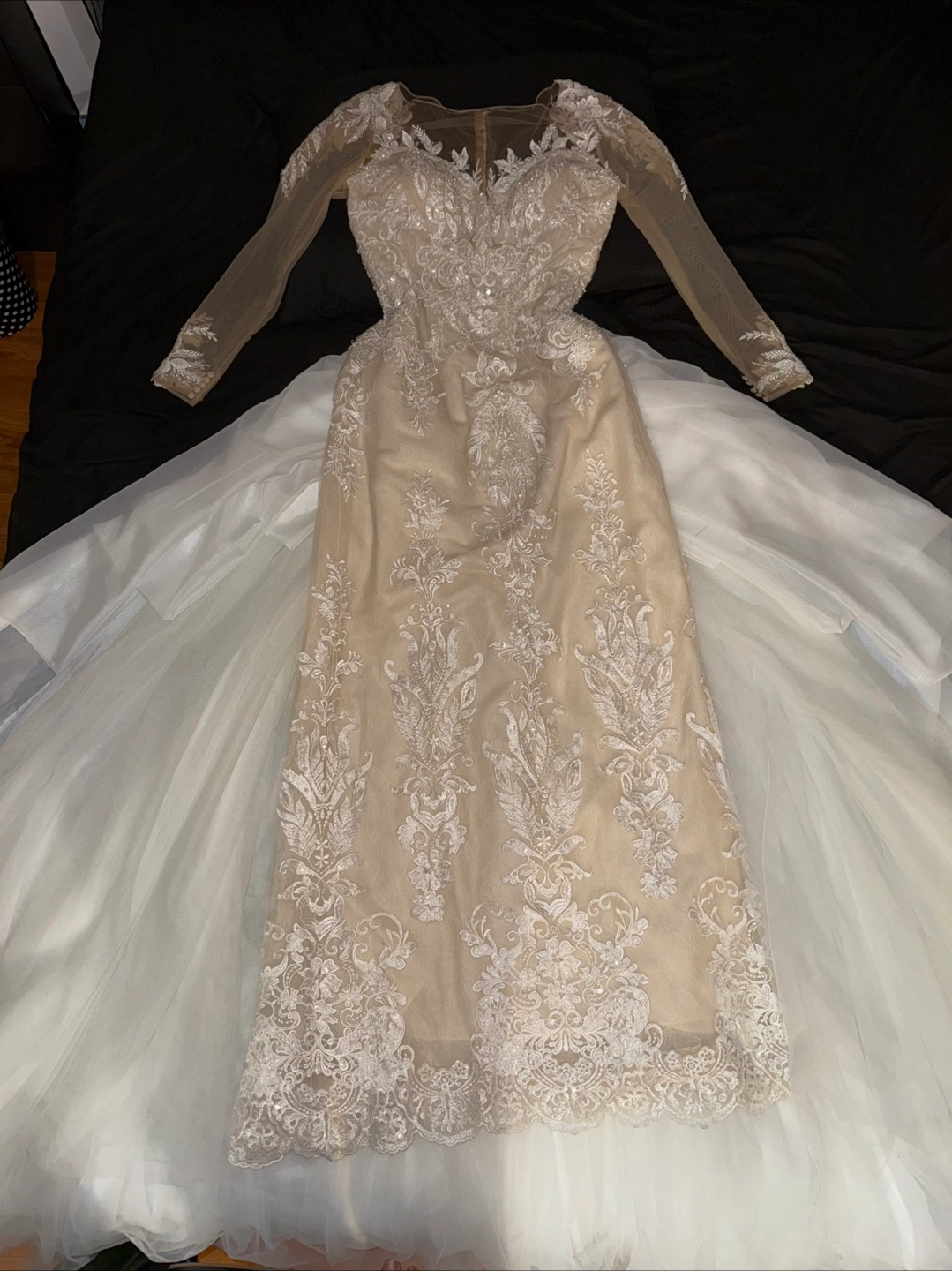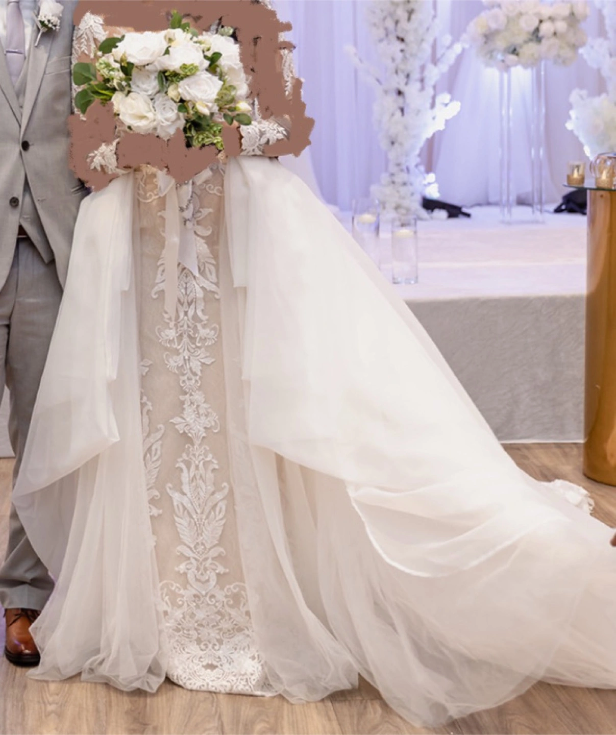 Worn once only Luxury wedding dress with an overskirt from David’s Bridal that you can wear in two different styles (colour: ivory and champagne). Only worn once. This is a long-sleeved dress that features embroidered and corded lace appliques stretch throughout this form-fitting bridal dress with an elegant back slit. The dress has an internal simple waist shaper which creates a more defined silhouette by cinching the waist and smoothing torso. Completing this look is a detachable overskirt that extends into a semi-cathedral train transforming your look into a royalty. Two additional items are included with the purchase of this dress; a one-Tier Lace Applique Edge Cathedral Bridal Veil with 3D flowers (colour: ivory) and a flexible crystal headpiece. The veil is 350 cm in length and the width is 300 cm. *The total value of the dress with the professional alterations is around 2800 CAD. The wedding dress comes with a bridal dust bag Measurements: The dress is size 12-14 Bust/Chest: 36 Inches (91.4 cm) Waist: 32: Inches (98.3 cm) Hip: 45 Inches (114.3 cm) Height: 62 Inches (157.5 cm) Note: the overskirt will need steaming to look fluffier and bigger. Open to reasonable offers!