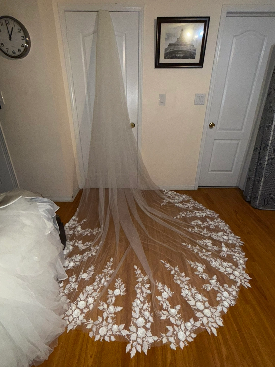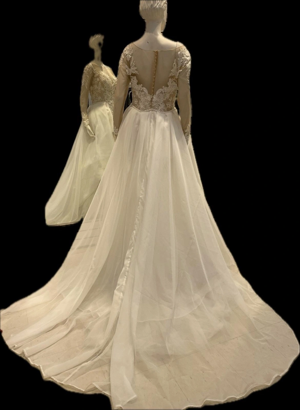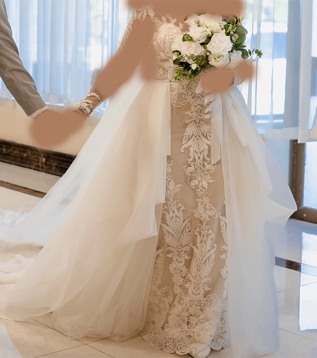 Worn once only Luxury wedding dress with an overskirt from David’s Bridal that you can wear in two different styles (colour: ivory and champagne). Only worn once. This is a long-sleeved dress that features embroidered and corded lace appliques stretch throughout this form-fitting bridal dress with an elegant back slit. The dress has an internal simple waist shaper which creates a more defined silhouette by cinching the waist and smoothing torso. Completing this look is a detachable overskirt that extends into a semi-cathedral train transforming your look into a royalty. Two additional items are included with the purchase of this dress; a one-Tier Lace Applique Edge Cathedral Bridal Veil with 3D flowers (colour: ivory) and a flexible crystal headpiece. The veil is 350 cm in length and the width is 300 cm. *The total value of the dress with the professional alterations is around 2800 CAD. The wedding dress comes with a bridal dust bag Measurements: The dress is size 12-14 Bust/Chest: 36 Inches (91.4 cm) Waist: 32: Inches (98.3 cm) Hip: 45 Inches (114.3 cm) Height: 62 Inches (157.5 cm) Note: the overskirt will need steaming to look fluffier and bigger. Open to reasonable offers!