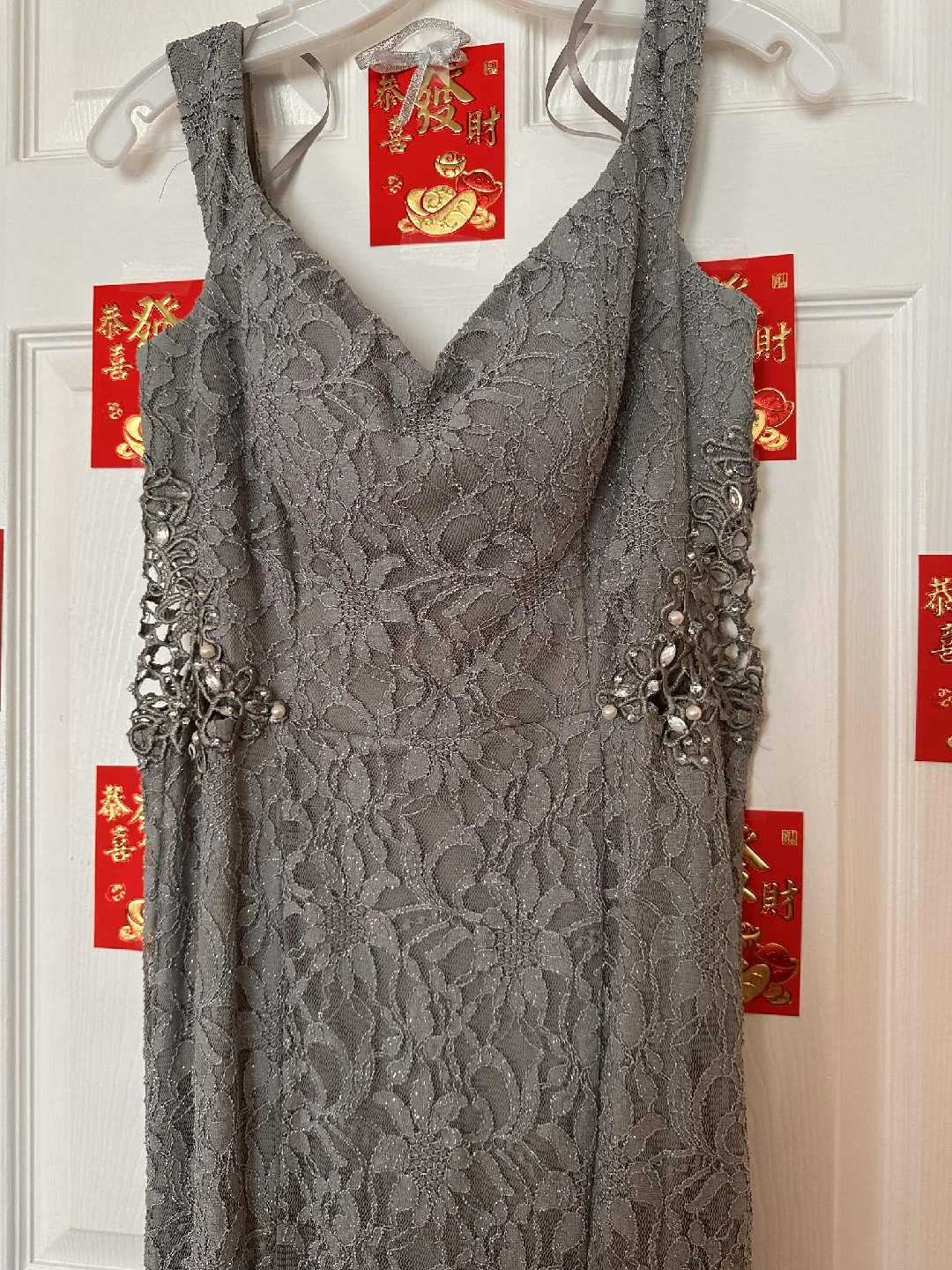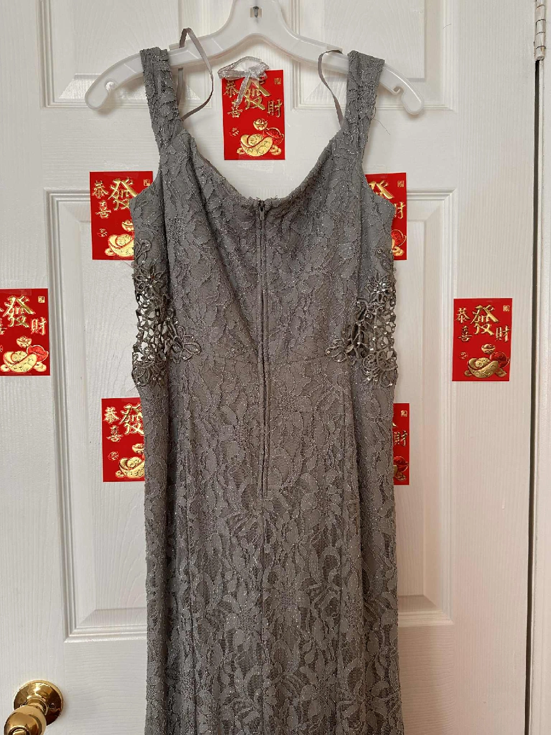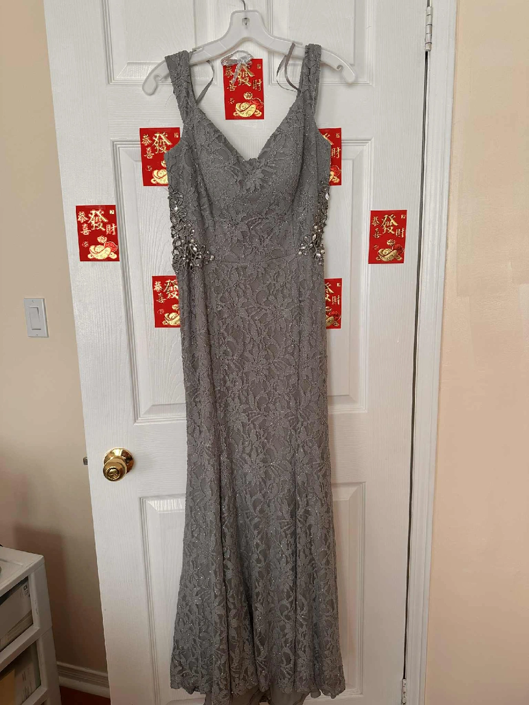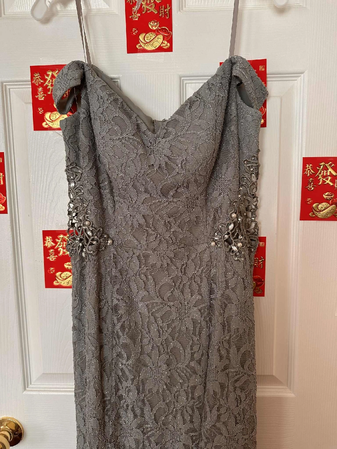 Selling a lovely grey lace dress from David's Bridal. It's in great condition and comes with a garment bag for storage. Perfect for a special occasion!