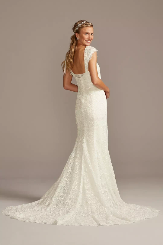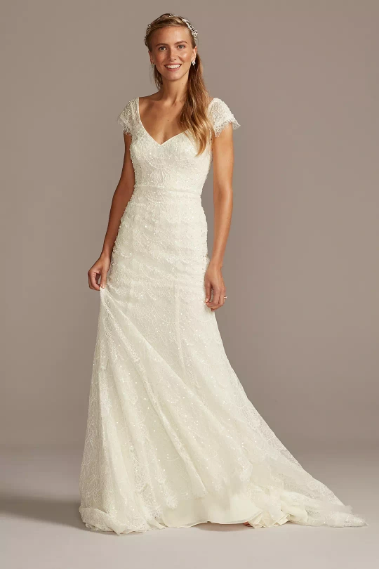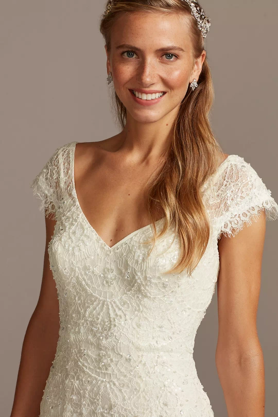 Stunning David's Bridal Melissa Sweet wedding dress. Features beaded lace, a V-neckline, and a fit-and-flare silhouette. Short sleeves and low back. Belt was added and minor alterations made mostly to the straps of the underdress the size is still true dress size as the structure of the dress was not altered. Keep in mind dress size is very different from clothing size. I'm typically a size 6 in pants. The dress has been professionally cleaned and is still in the bag.