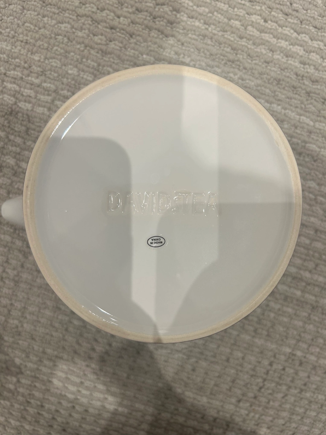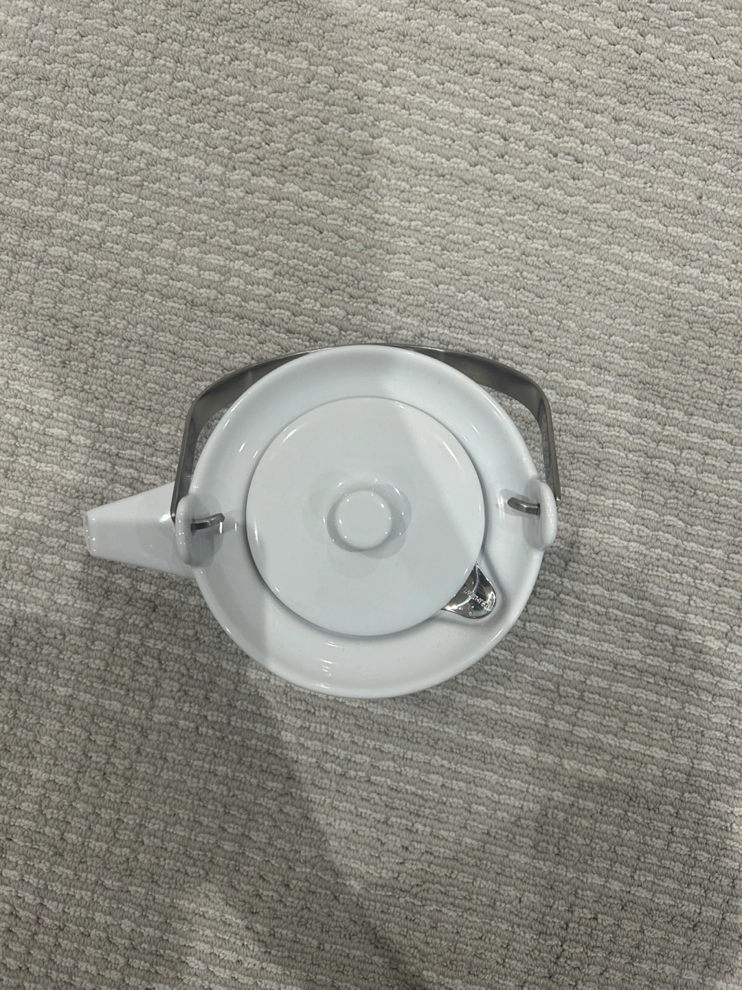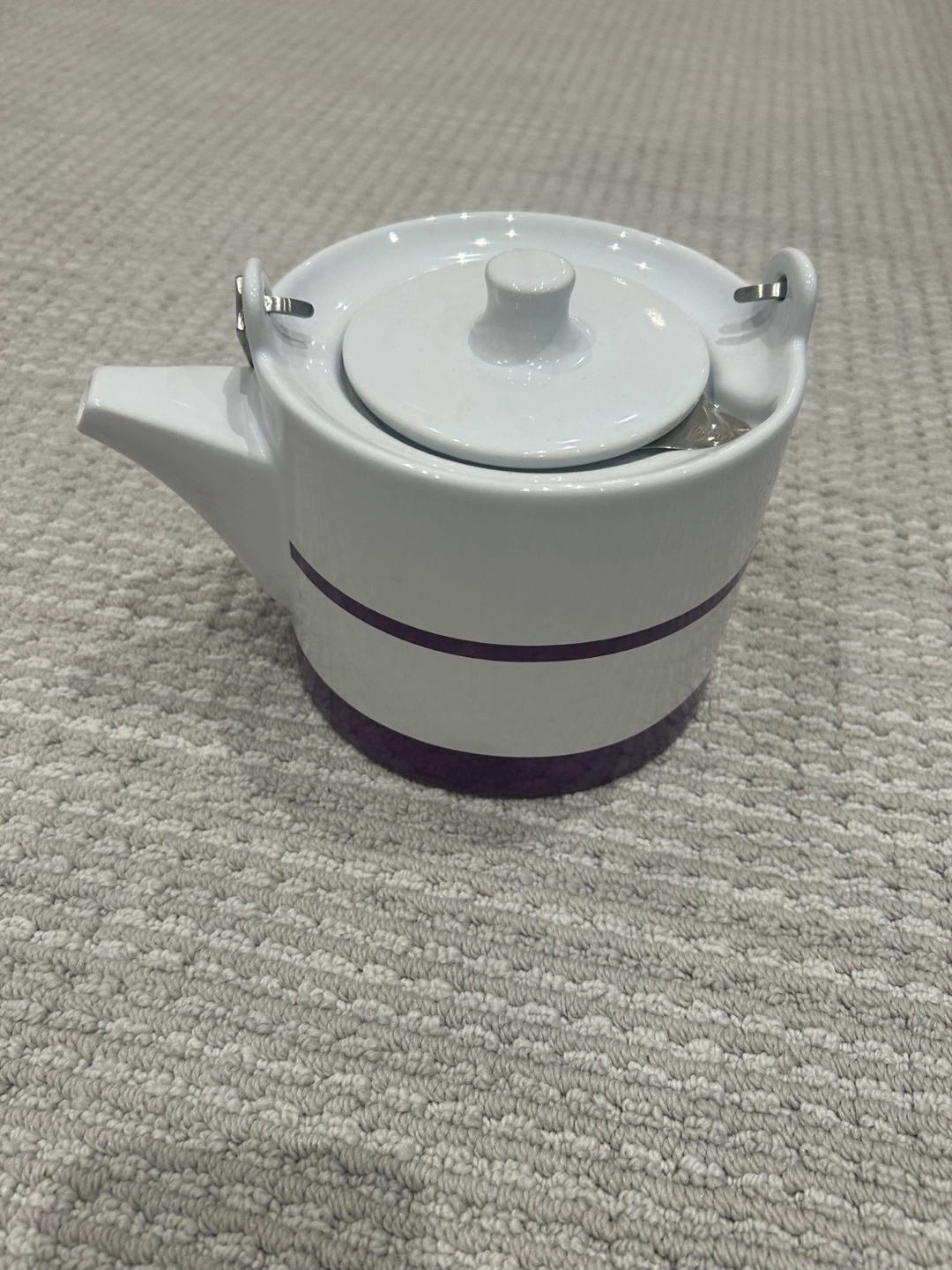 10Retro style ceramic teapot from DAVIDs Tea. White and purple colours. Handle is metal. If interested, 8 matching mugs are separately available. Mugs are white with insides all purple. Never used. In excellent condition.