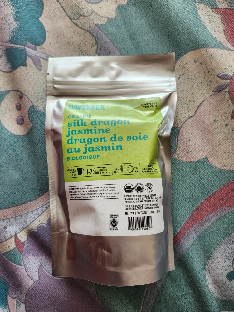 Selling a new, unopened bag of DAVIDsTEA Organic Silk Dragon Jasmine Tea! This is a green tea from Jiangxi and Fujan Provinces, scented with jasmine flowers. It's a medium caffeine tea, perfect for a relaxing cup 🍵 Retail price currently on the company website is $11.48.