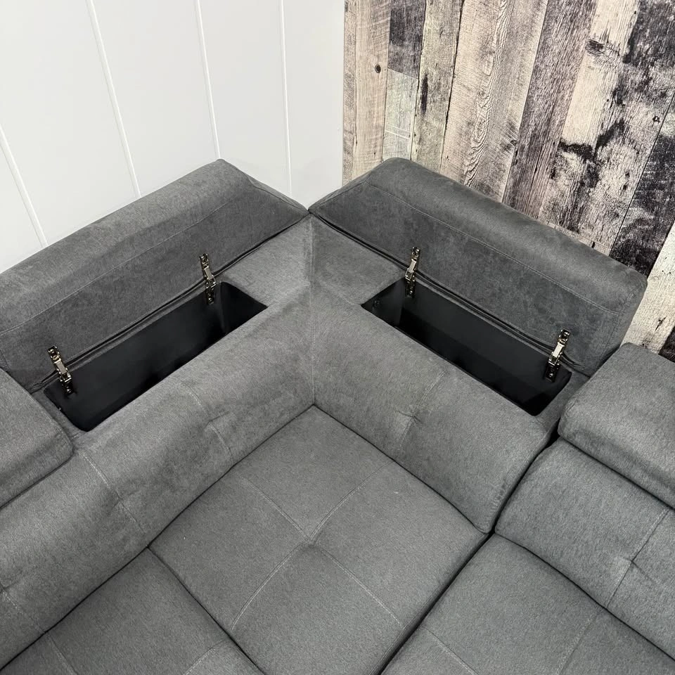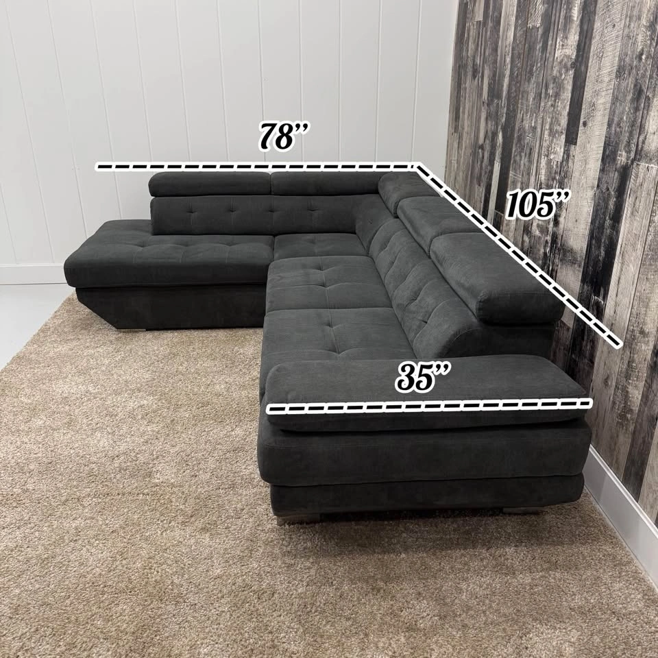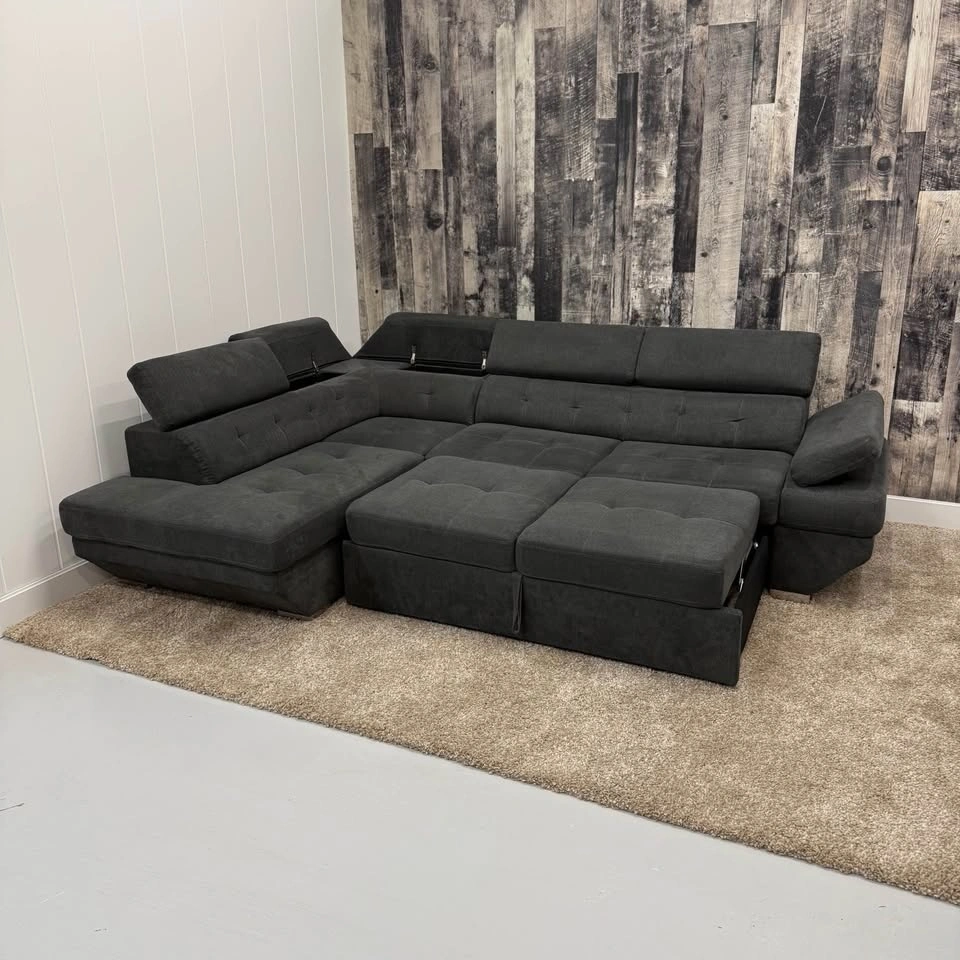 Adjustable headrests, adjustable armrest, pull-out sleeper, built-in storage, USB charging port, tufted seat design. Professionally steam cleaned with fabric shampoo and enzyme treatment. This sectional sofa / couch came from a non-smoking home with no stains, rips, or tears. Dimensions shown in the last photo.