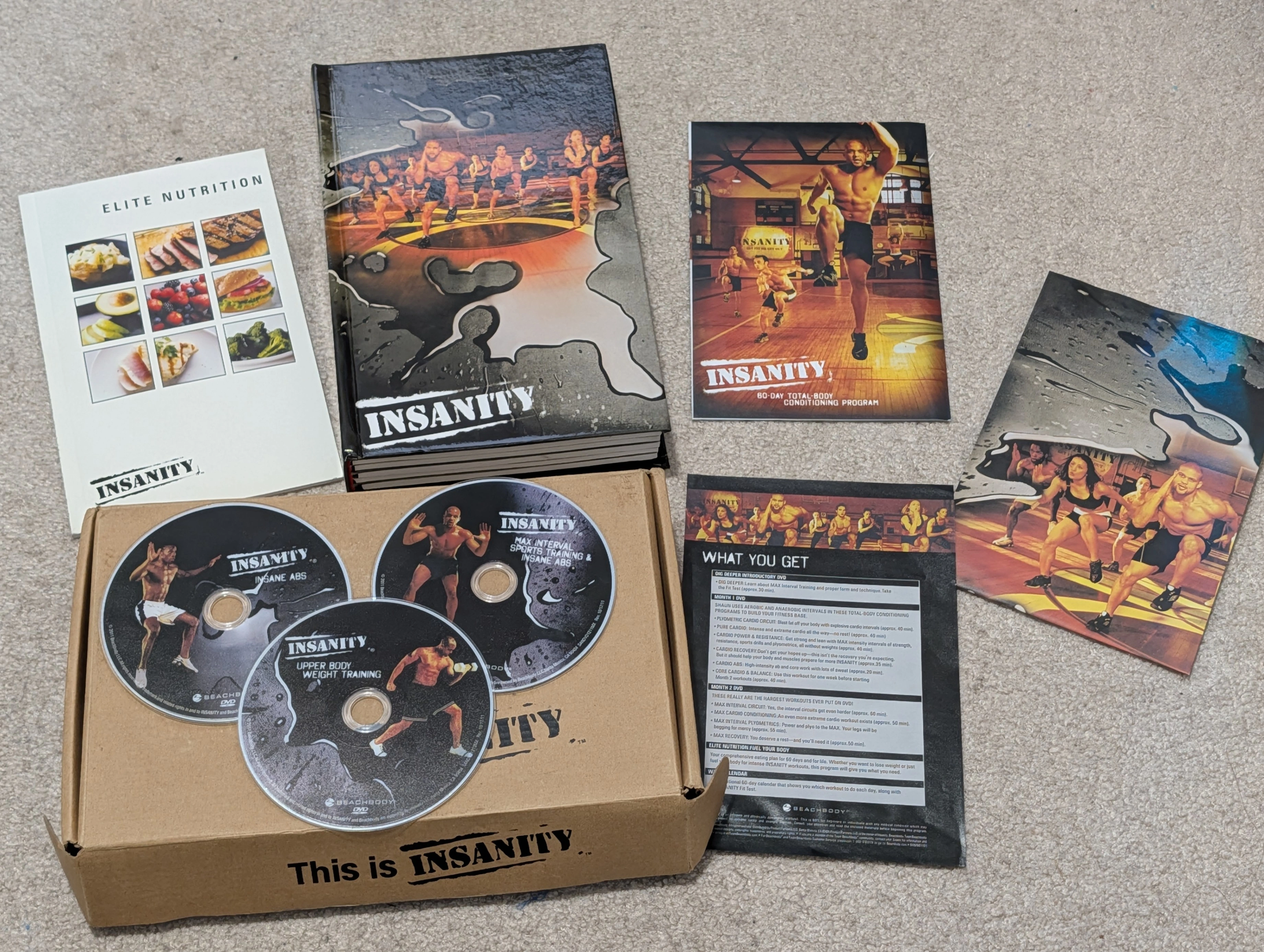 Get ready to transform your body with the Insanity 60-Day Total Body Conditioning Program! This set includes everything you need to get started on your fitness journey. You'll receive the Elite Nutrition guide, workout DVDs covering Insane Abs, Max Interval Sports Training & Insane Abs, and Upper Body Weight Training, plus a 60-day workout calendar to track your progress. Time to get in shape!