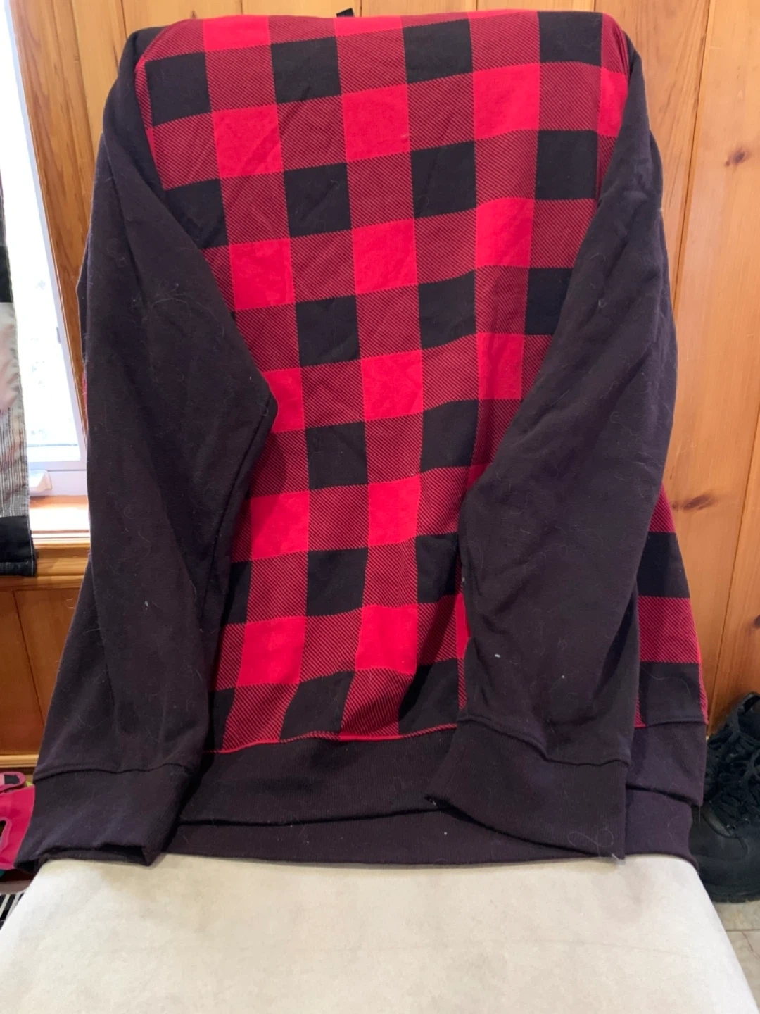 Cozy plus size crewneck sweatshirt with a classic red and black buffalo plaid pattern on the body. The sleeves and ribbed cuffs are a solid black. It's a comfortable piece for casual wear. This sweatshirt is great for chilly days or layering!