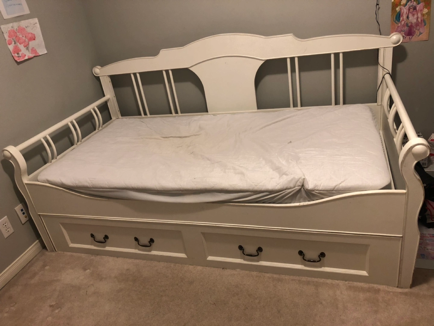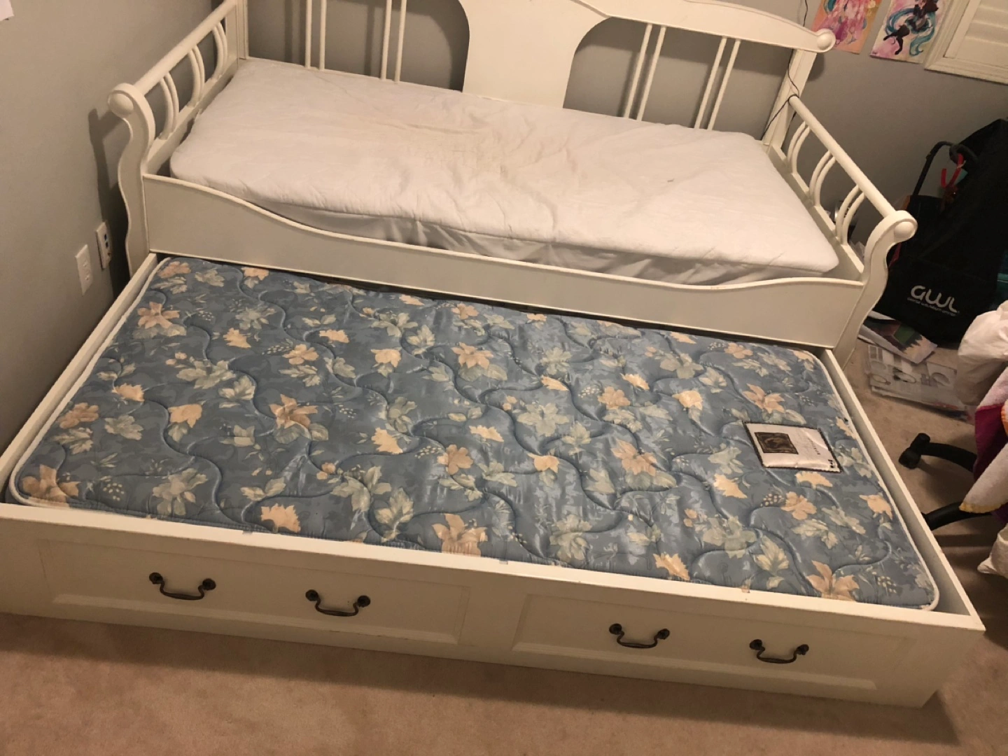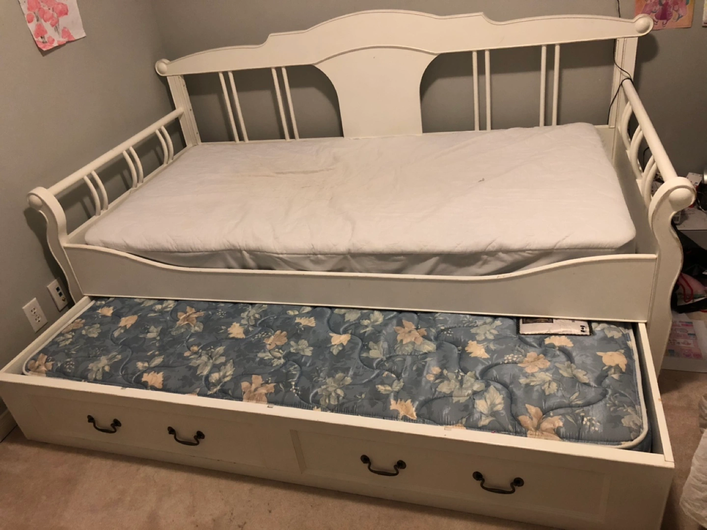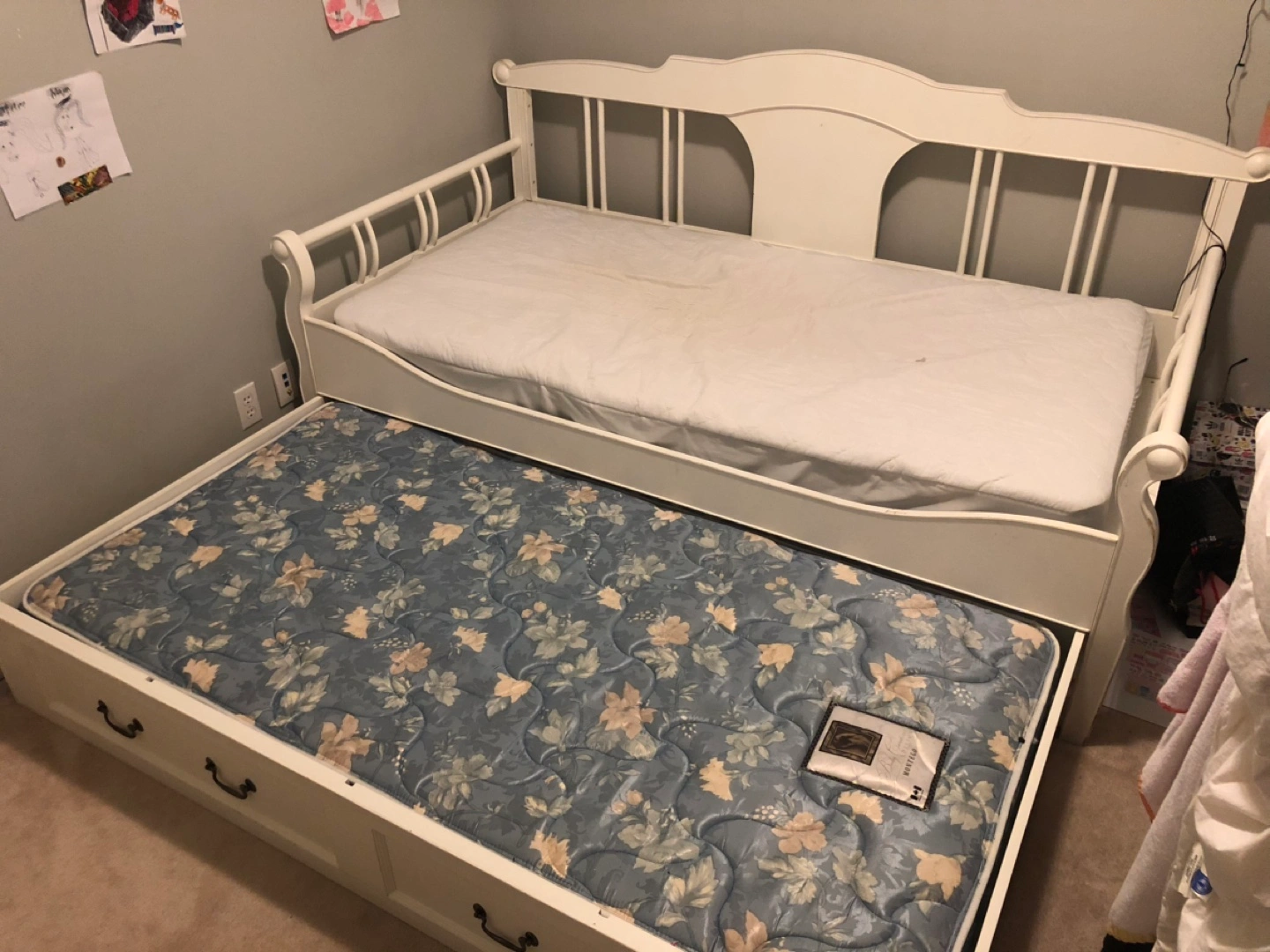 Daybed & trundle purchased from The Bombay Company. Solid wood frame. The trundle can provide a comfortable extra bed for overnight guests (mattress included ) - or- generous storage space for toys, clothes, bedding and more when used without a mattress. Trundle is fitted with rolling casters that make it easy for kids to open up and put away by themselves.
