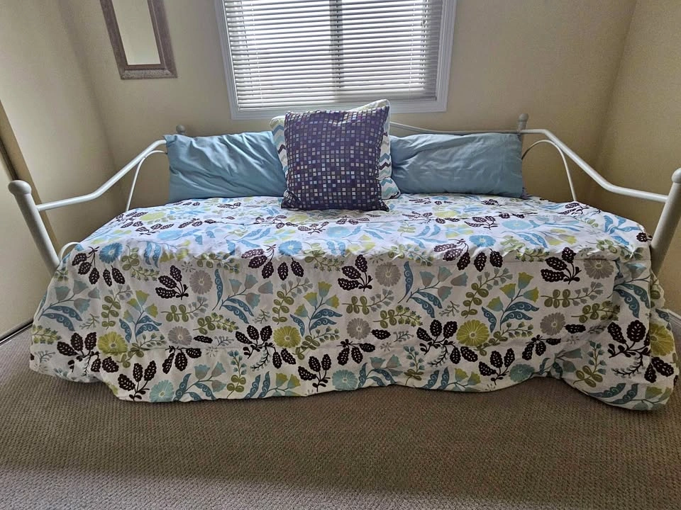 19Selling a comfy daybed that comes with a lovely floral cover and matching pillows! It's perfect for adding a cozy touch to any room in your home. The frame is white and the floral cover features blues, greens, and browns. 77" x 40" x 36"