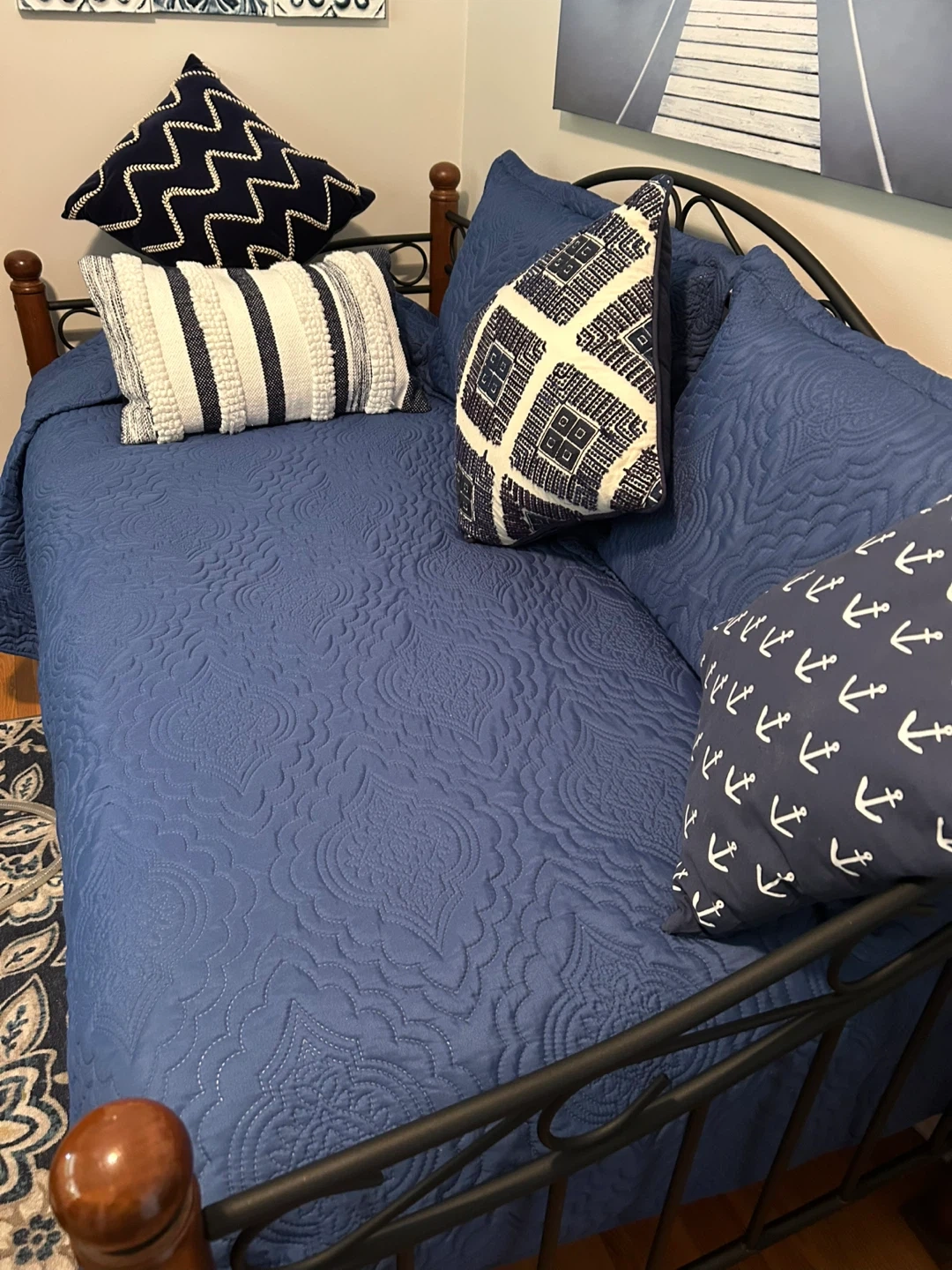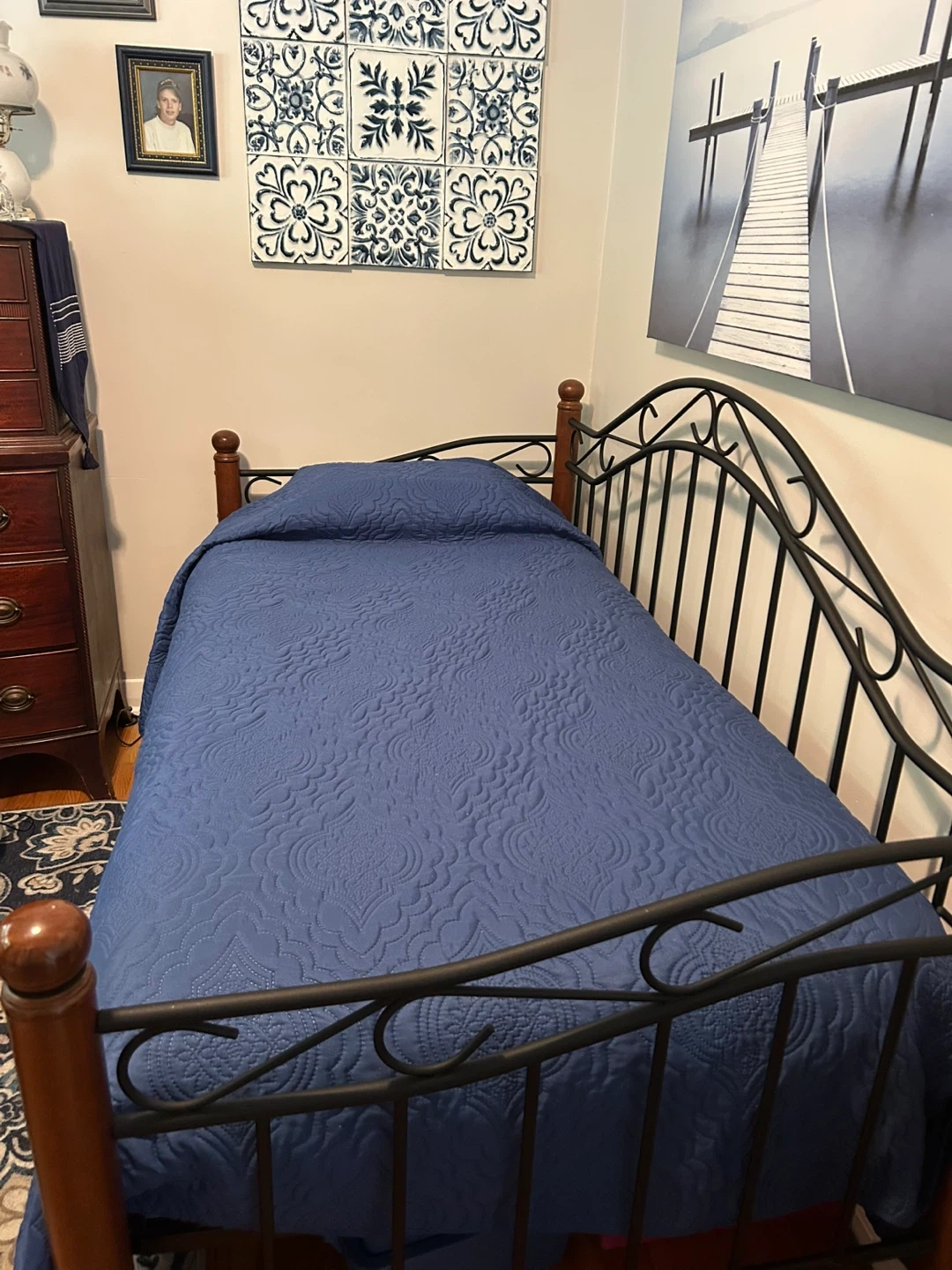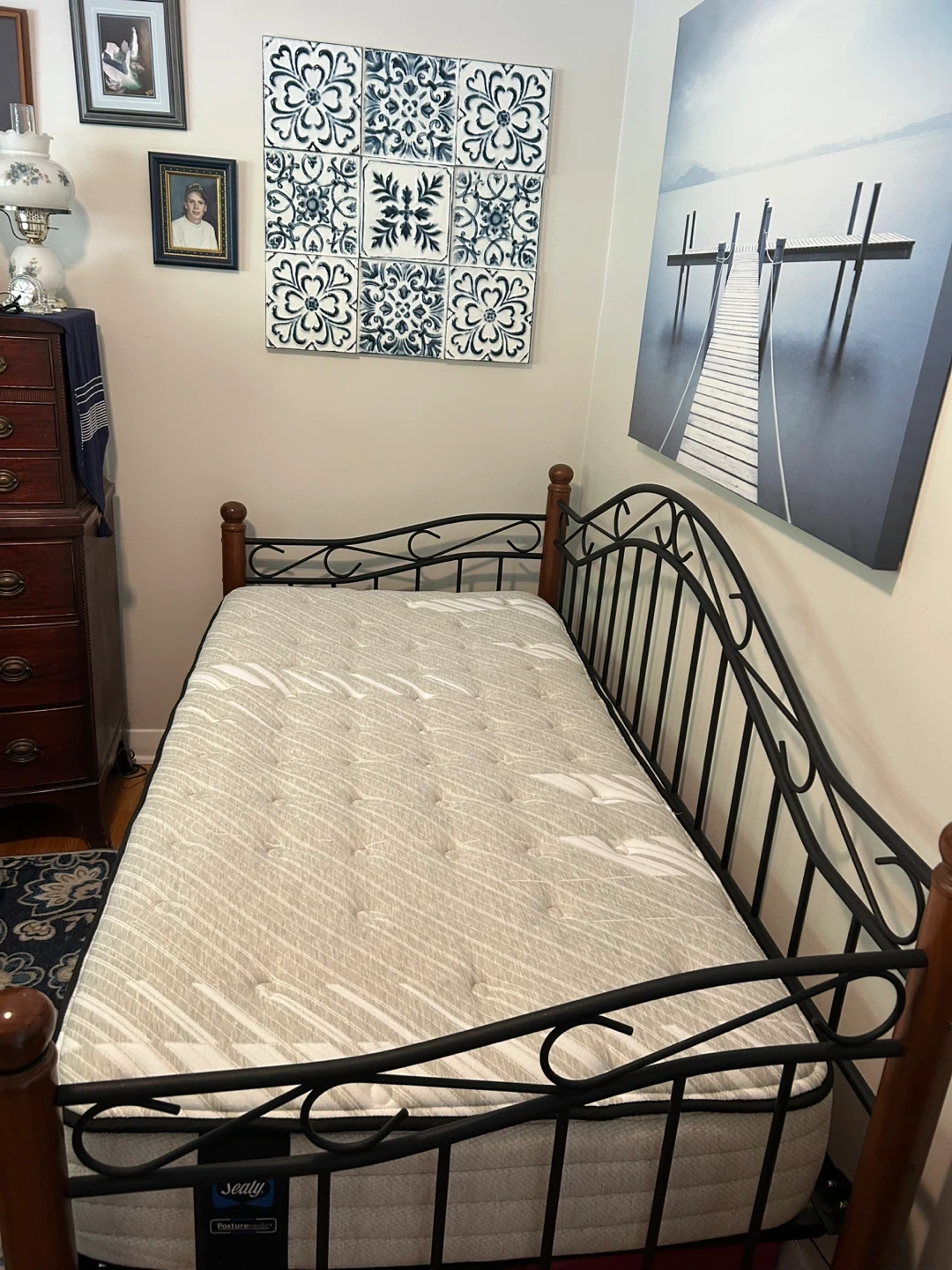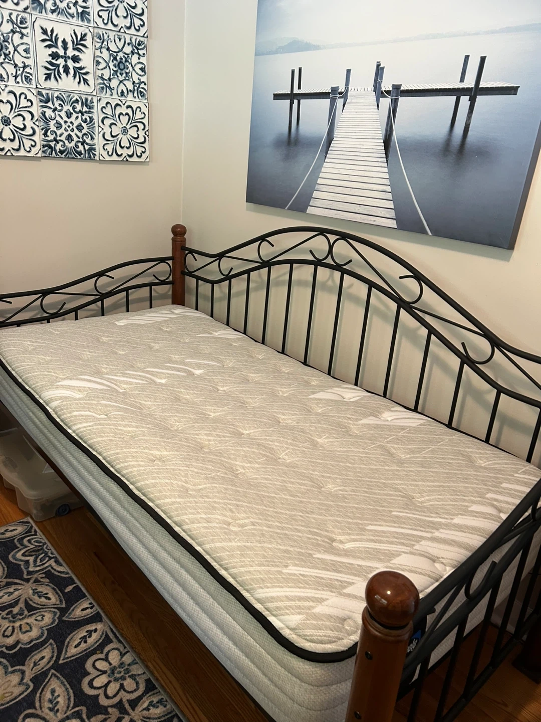 Wood& iron solid daybed. Mattress 1 year old, like new. Toss in , mattress pad cover & sheets. Pick up. Very comfortable.