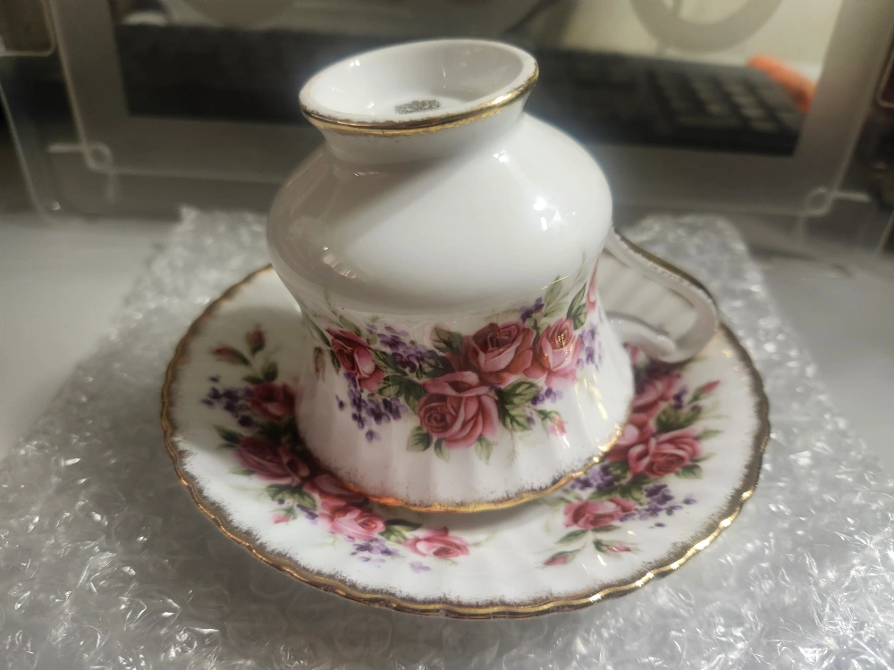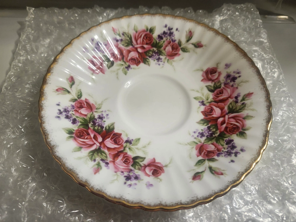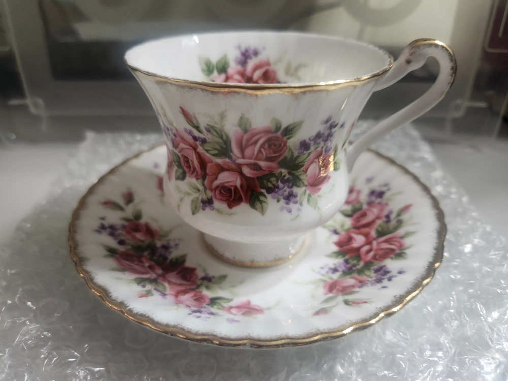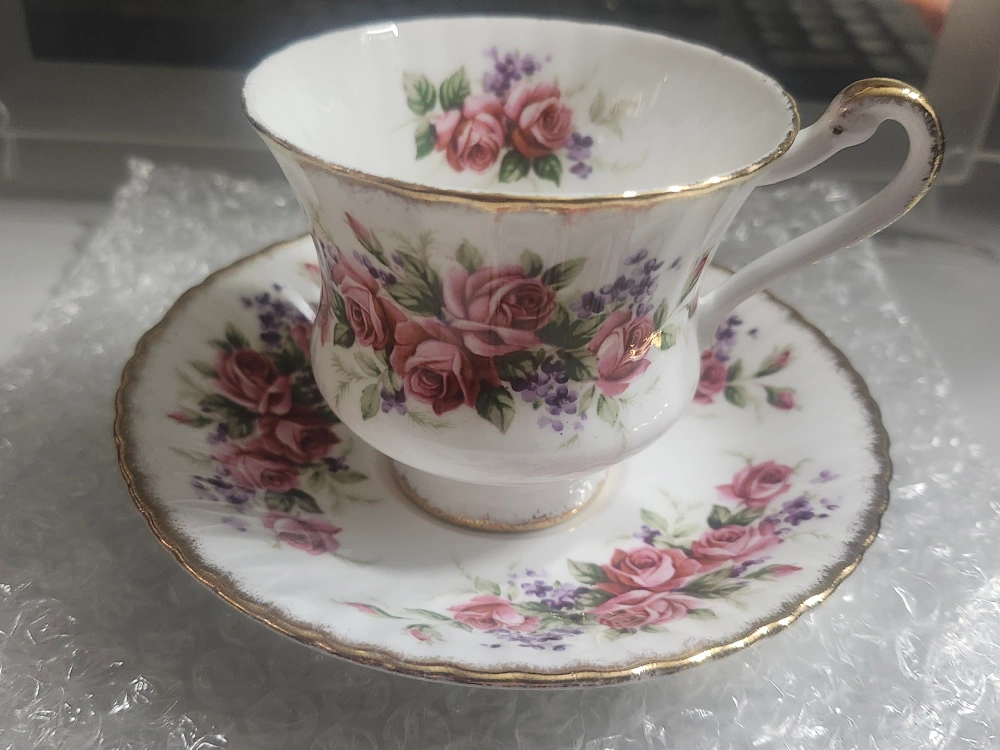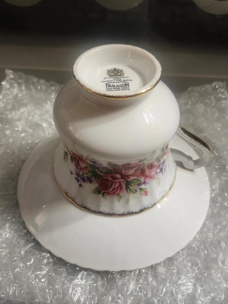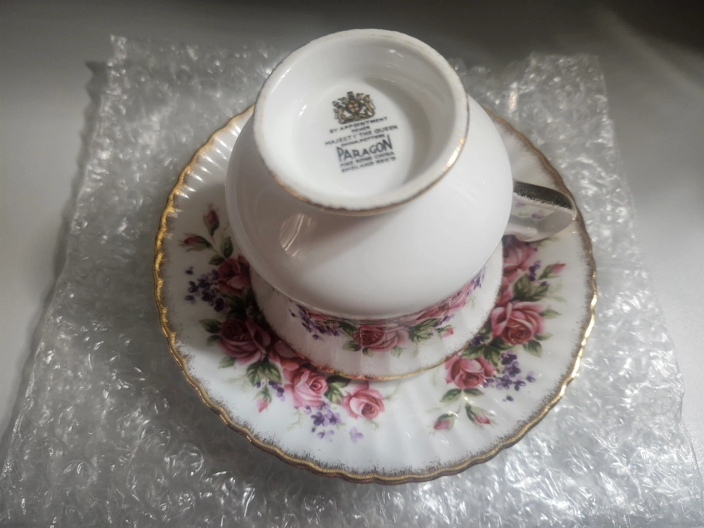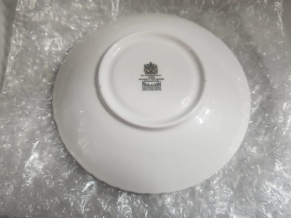 Selling a lovely Paragon fine bone china tea cup and saucer set. It features a beautiful rose and floral pattern with gold trim. Perfect for tea time or as a decorative piece !