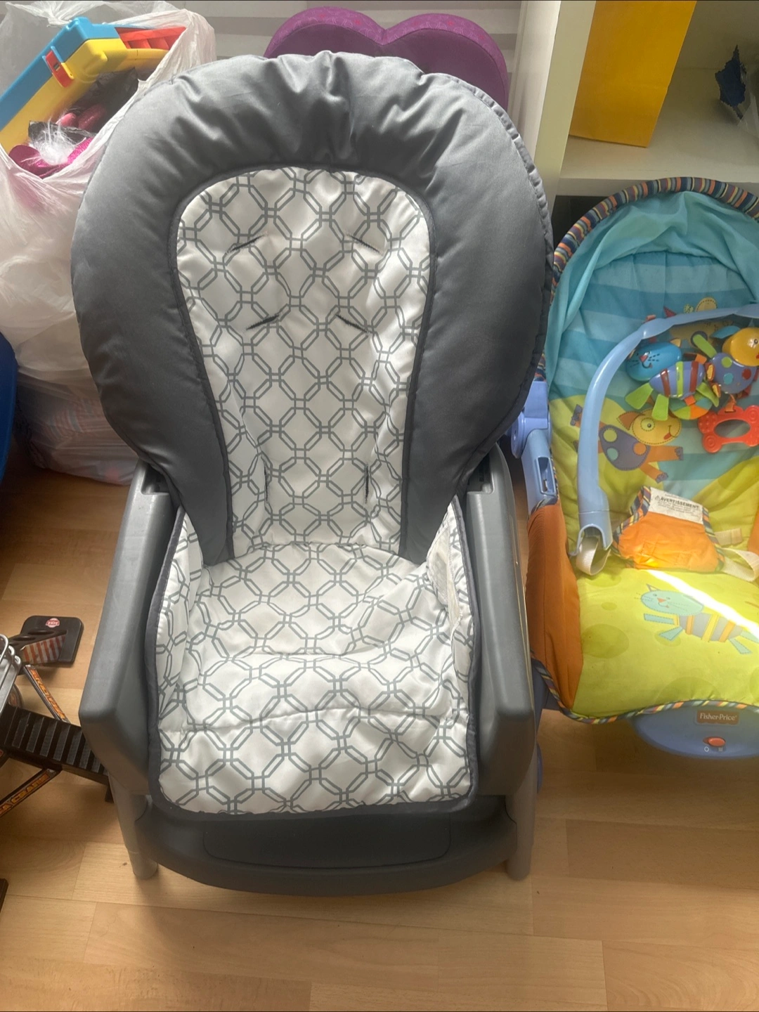 Grey baby chair with a cushioned seat. Featuring a patterned interior and a supportive headrest. The bouncer has bright colours and toys suspended overhead. A great way to make sure baby has a safe and comfortable place to rest.