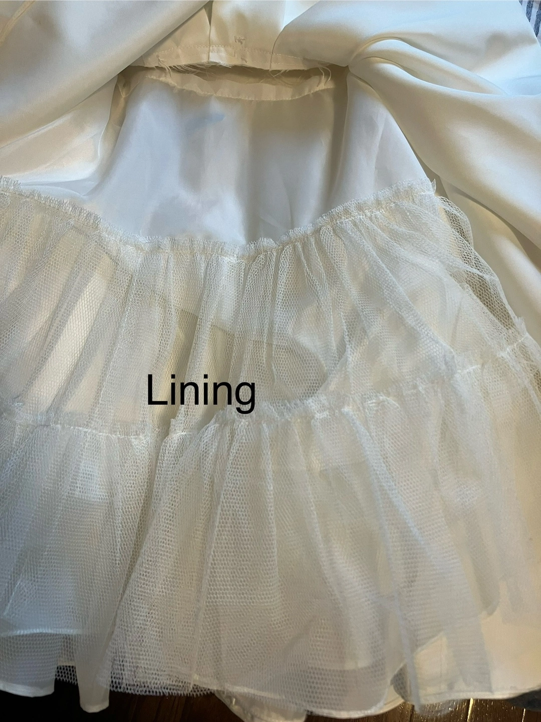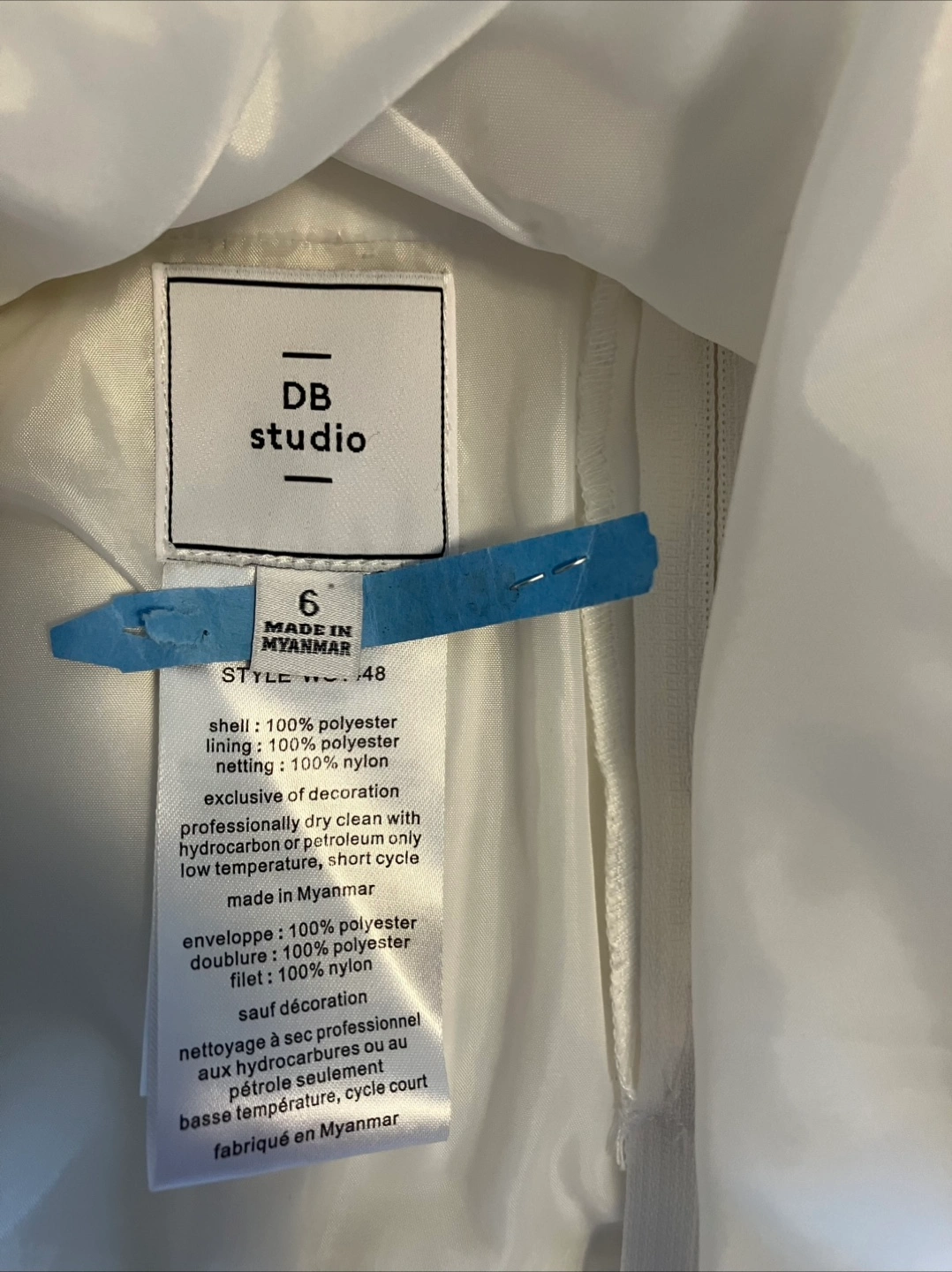 A beautiful white dress from DB Studio in size 6. It's made of 100% polyester shell and lining, with 100% nylon netting. The dress is like new and has been dry cleaned and is ready for a special occasion, First communion, wedding etc.