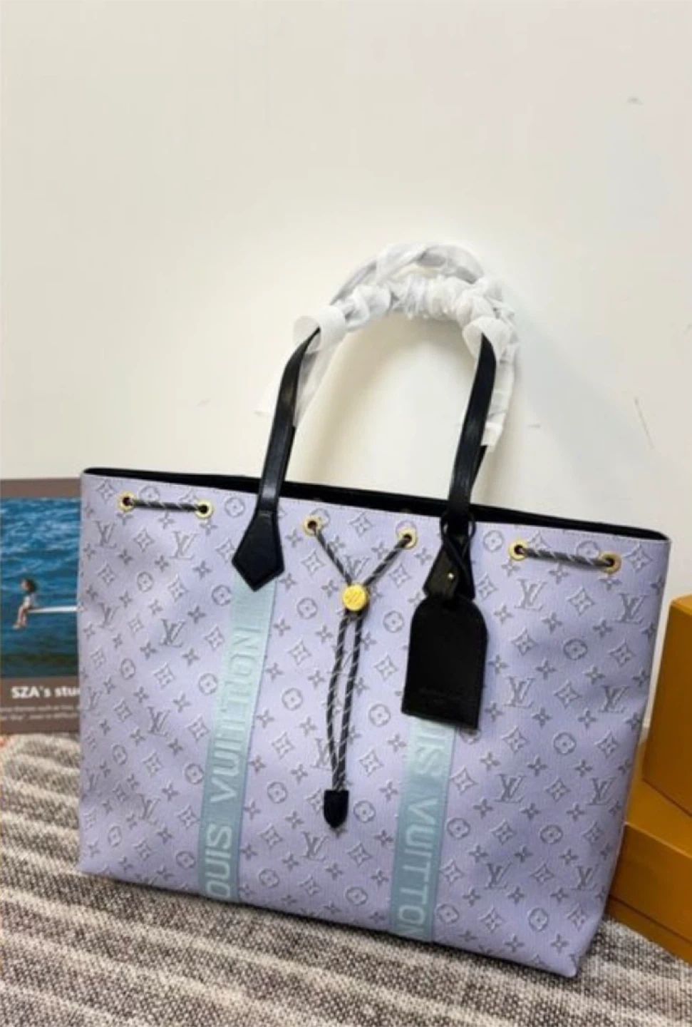 Stylish Louis Vuitton tote bag with a signature monogram pattern. It features black leather handles and a vibrant striped interior. Includes a dust bag for protection.