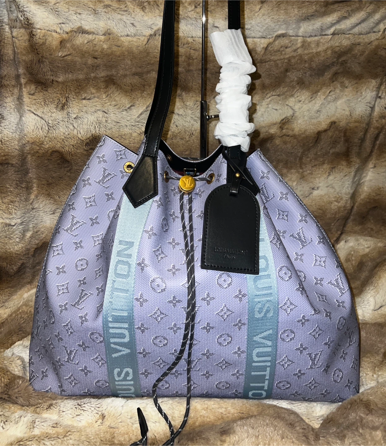 Stylish Louis Vuitton tote bag with a signature monogram pattern. It features black leather handles and a vibrant striped interior. Includes a dust bag for protection.