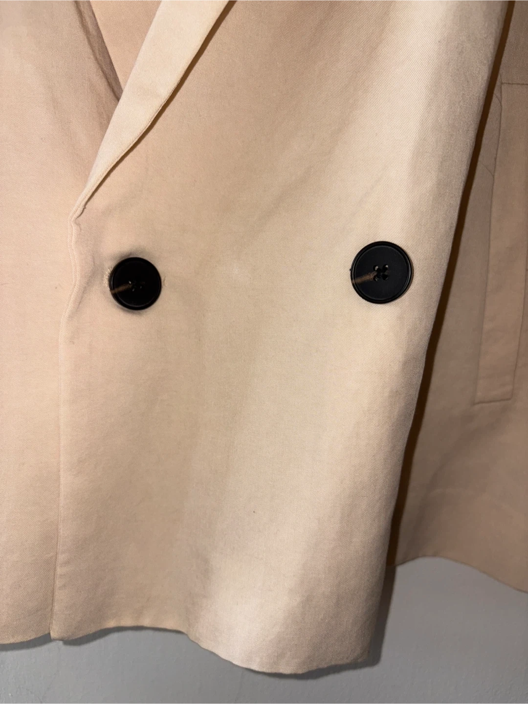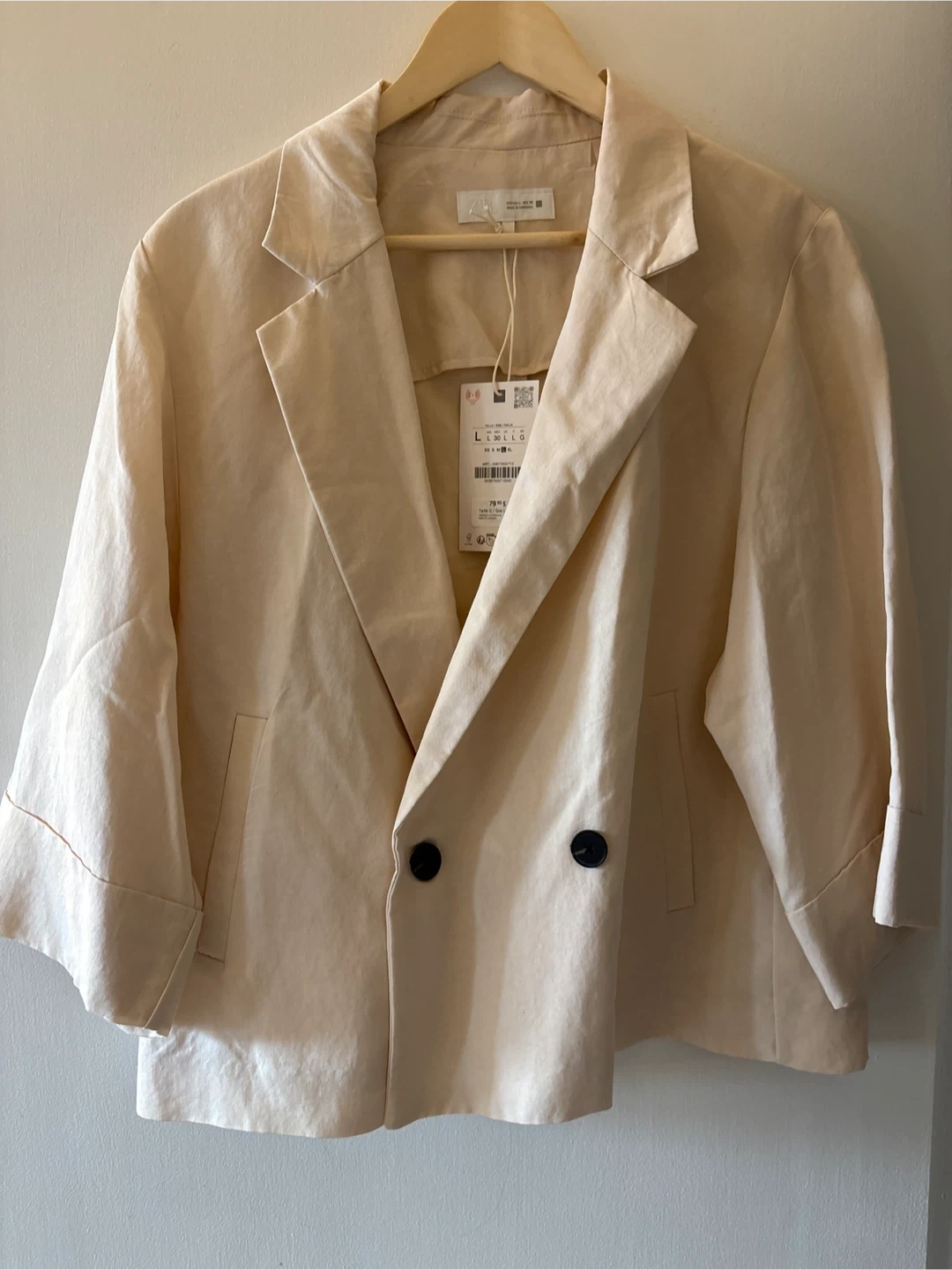 A beige double-breasted French cut blazer from ZARA. This jacket features a relaxed fit and three-quarter sleeves. It's made from a lightweight fabric and has black buttons. A versatile piece for your wardrobe!