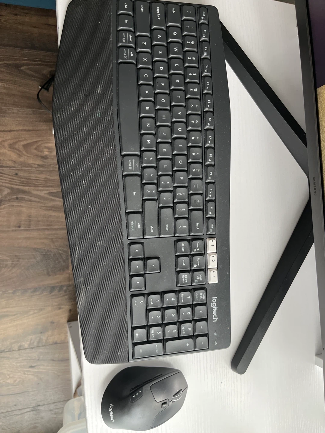 This is a Logitech wireless keyboard and mouse combo. It features an ergonomic design with a wrist rest. The mouse is also wireless with adjustable DPI settings. This can connect up to 3 devices