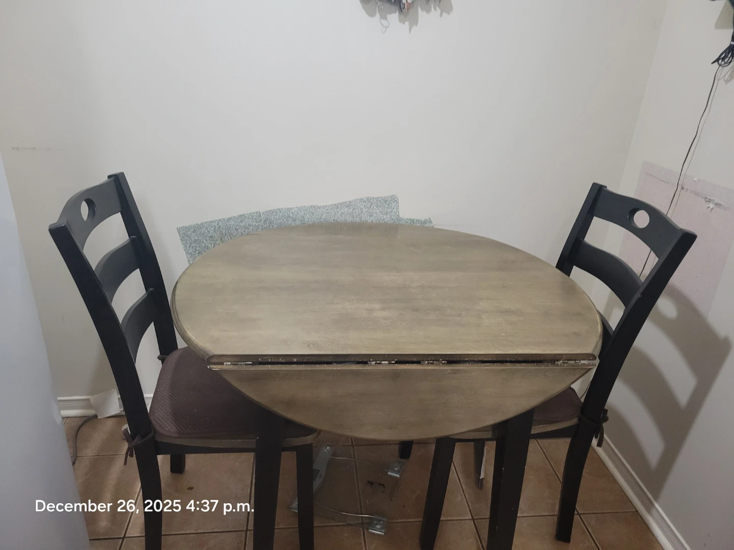 Selling a round drop leaf dining table with two chairs. It's a great set for smaller spaces, and the drop leaf design makes it versatile. The table is in good condition and the chairs are sturdy. Perfect for a kitchen nook or small dining area!