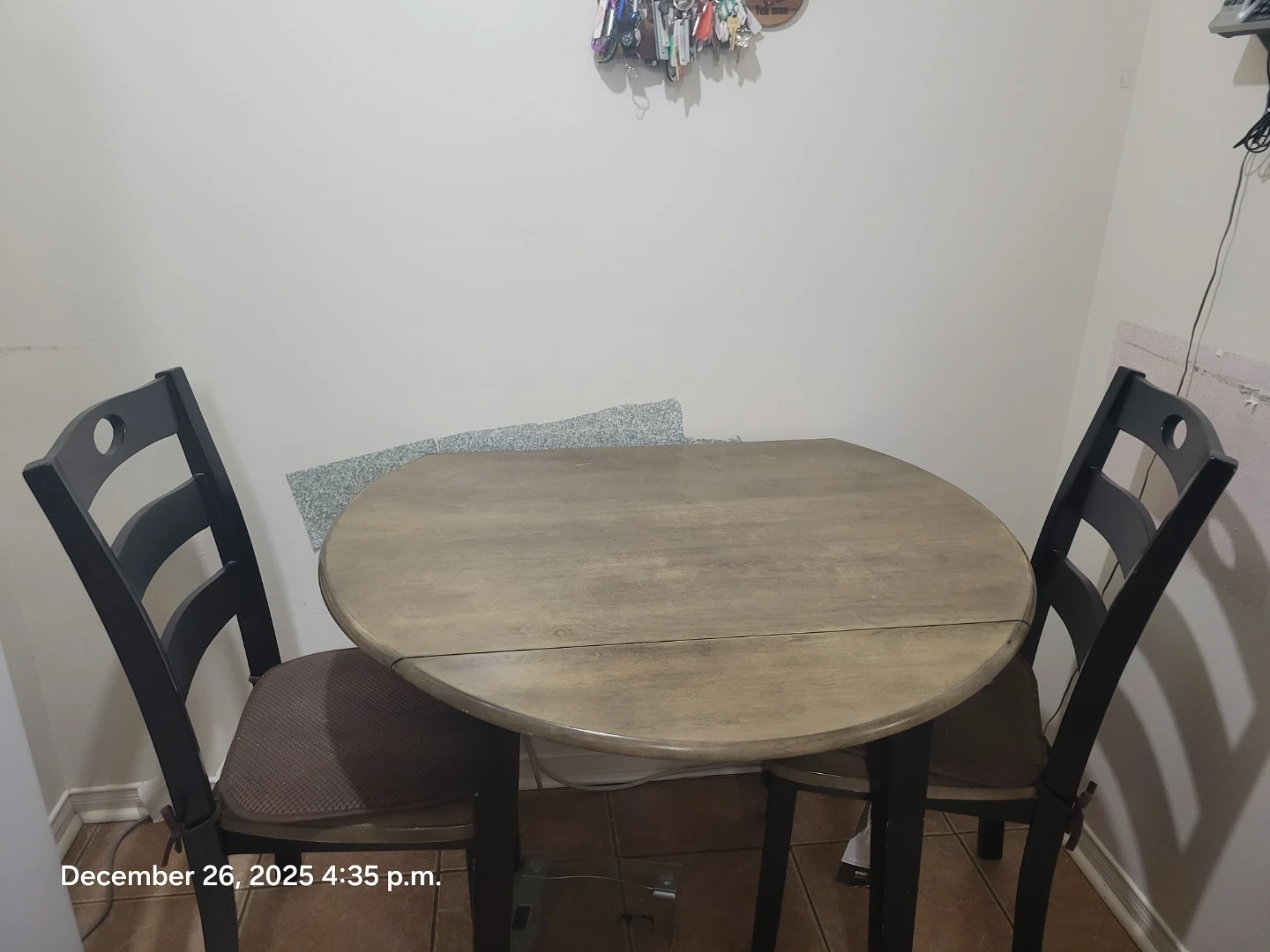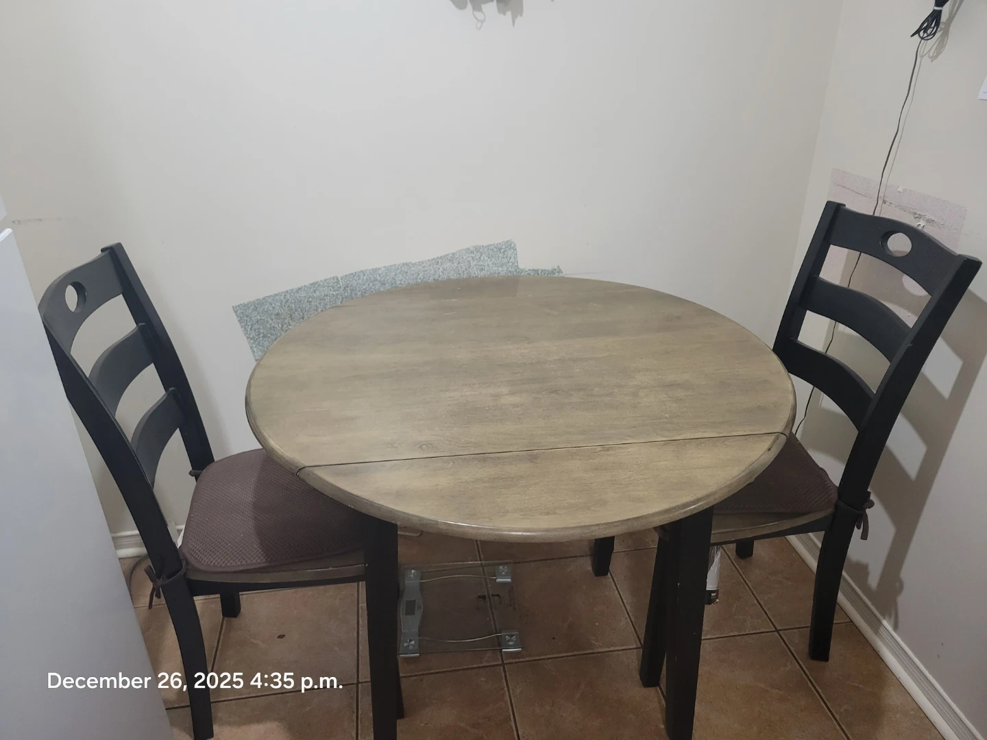 Selling a round drop leaf dining table with two chairs. It's a great set for smaller spaces, and the drop leaf design makes it versatile. The table is in good condition and the chairs are sturdy. Perfect for a kitchen nook or small dining area!