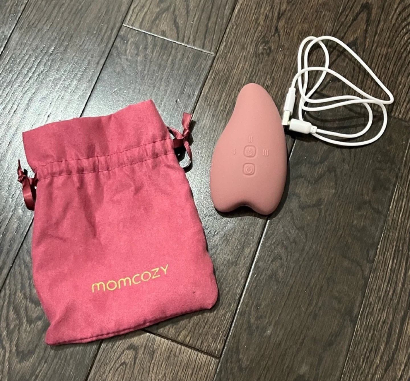 This Momcozy massage lactation device is pink and comes with a drawstring pouch and a USB charging cable. It features multiple vibration modes for relaxation.