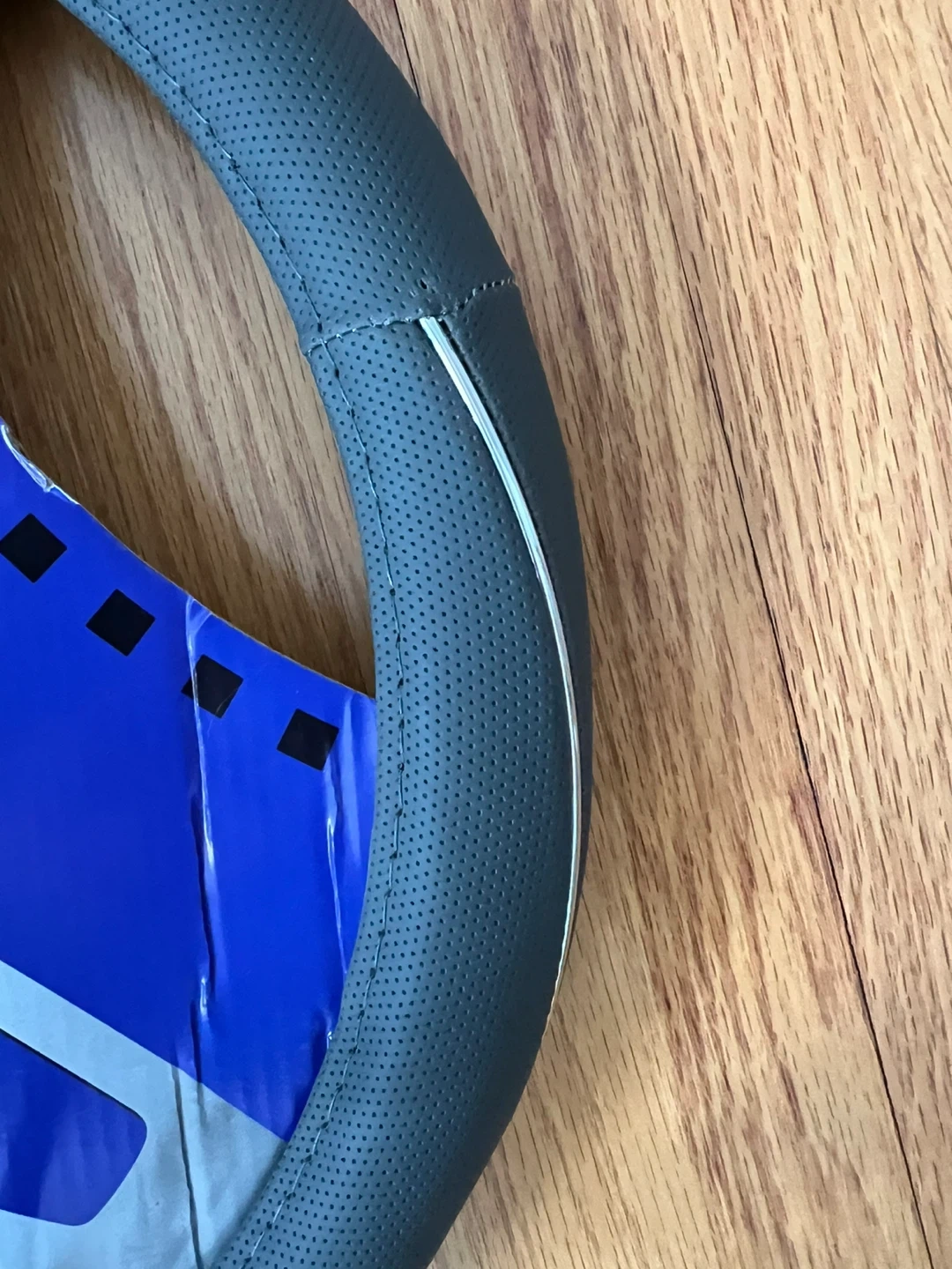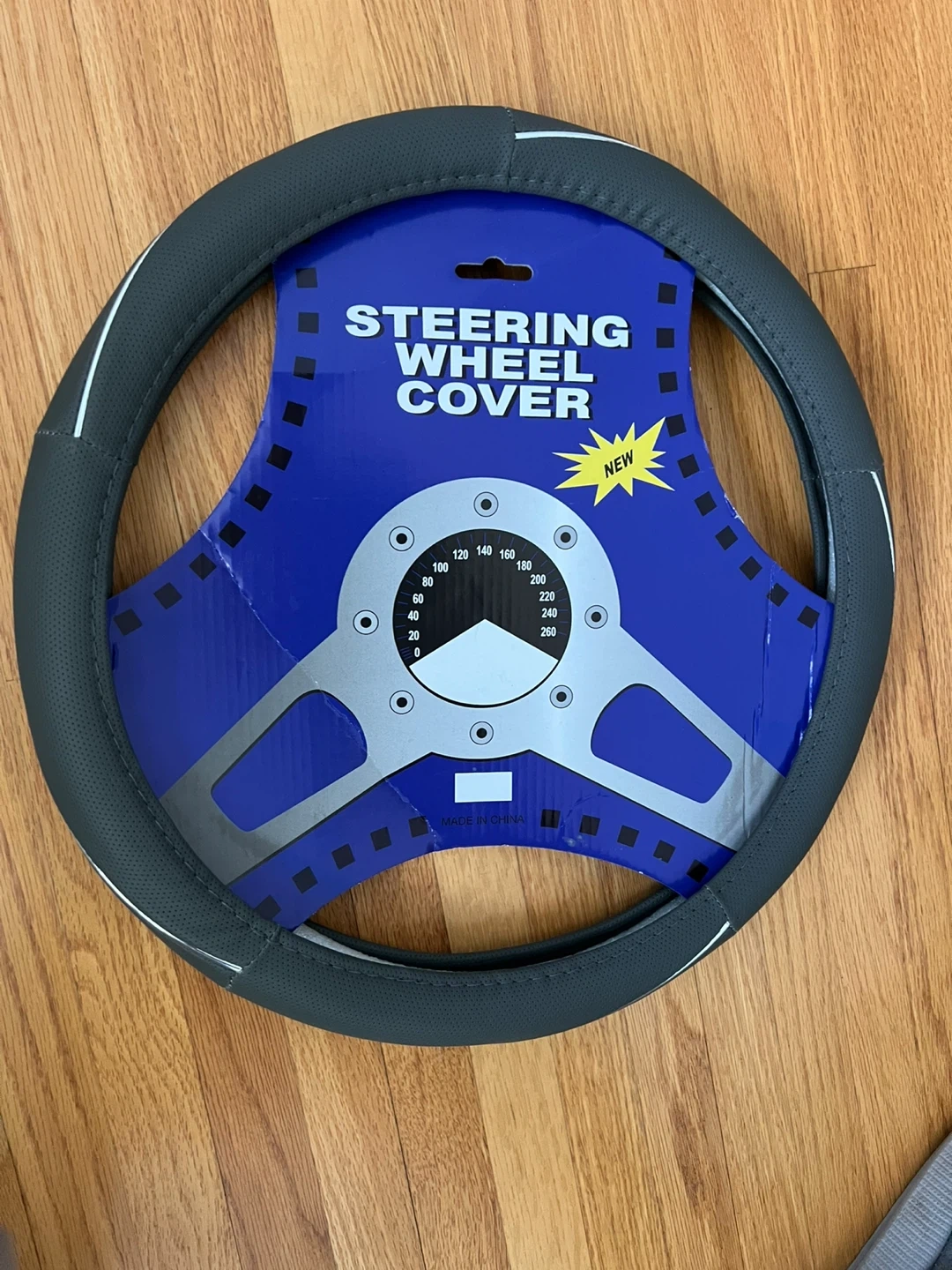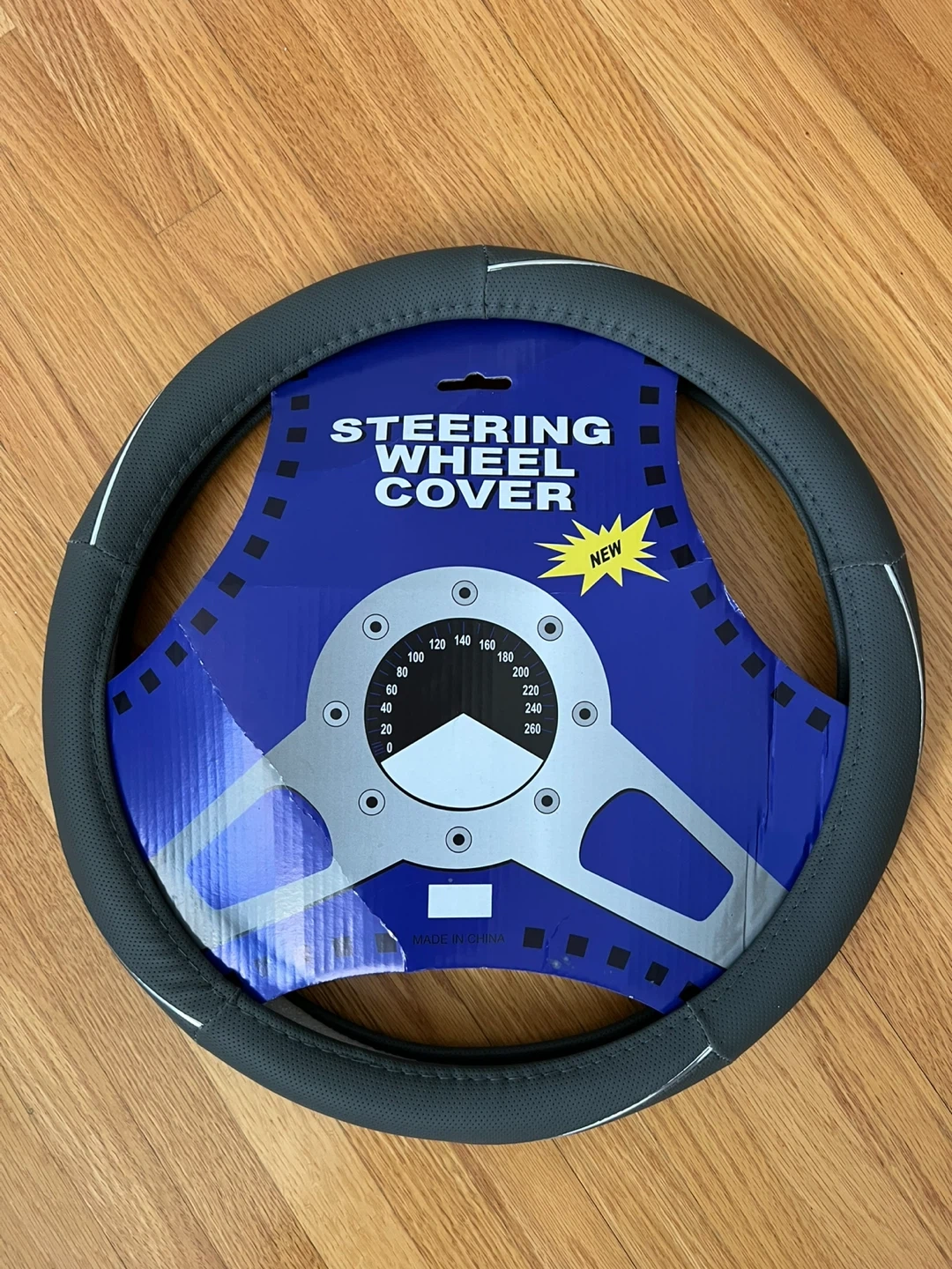 This is a new dark grey steering wheel cover. It's made from a perforated material with white stitching accents. It comes in its original packaging.