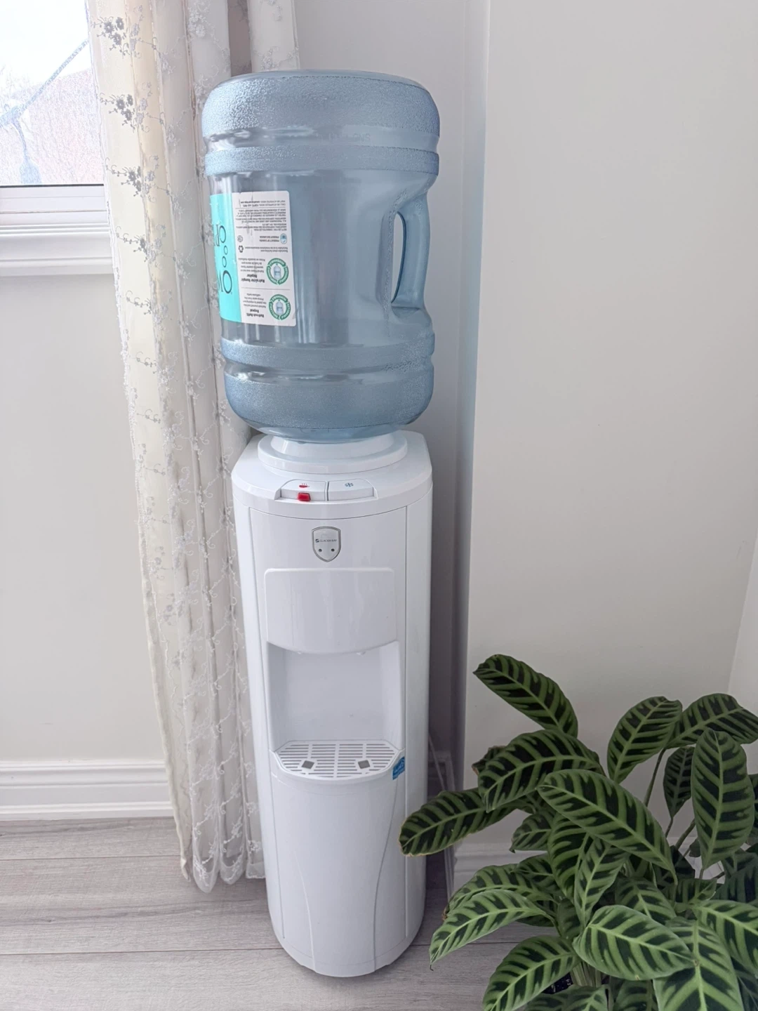 This Glacier Bay water dispenser provides both hot and cold water. It's a top-load model designed for floor standing placement. This unit dispenses clean water efficiently.