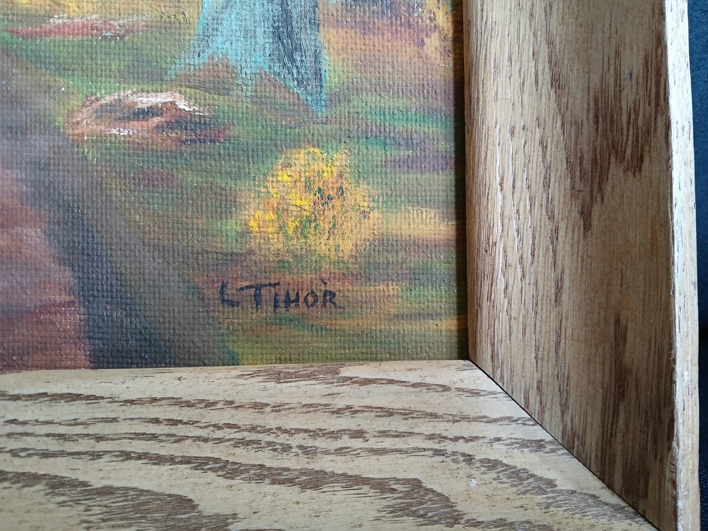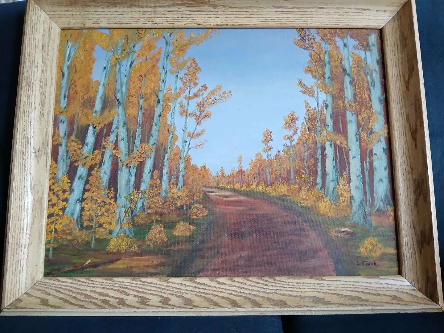 Original acrylic painting depicting an autumn forest scene with birch trees and a dirt road. It's signed by the artist, L. Thor. Style: His work characterized by the "commercial gallery " style of the 1960s -80s- well executed, decorative original oils intended for home or office decor.