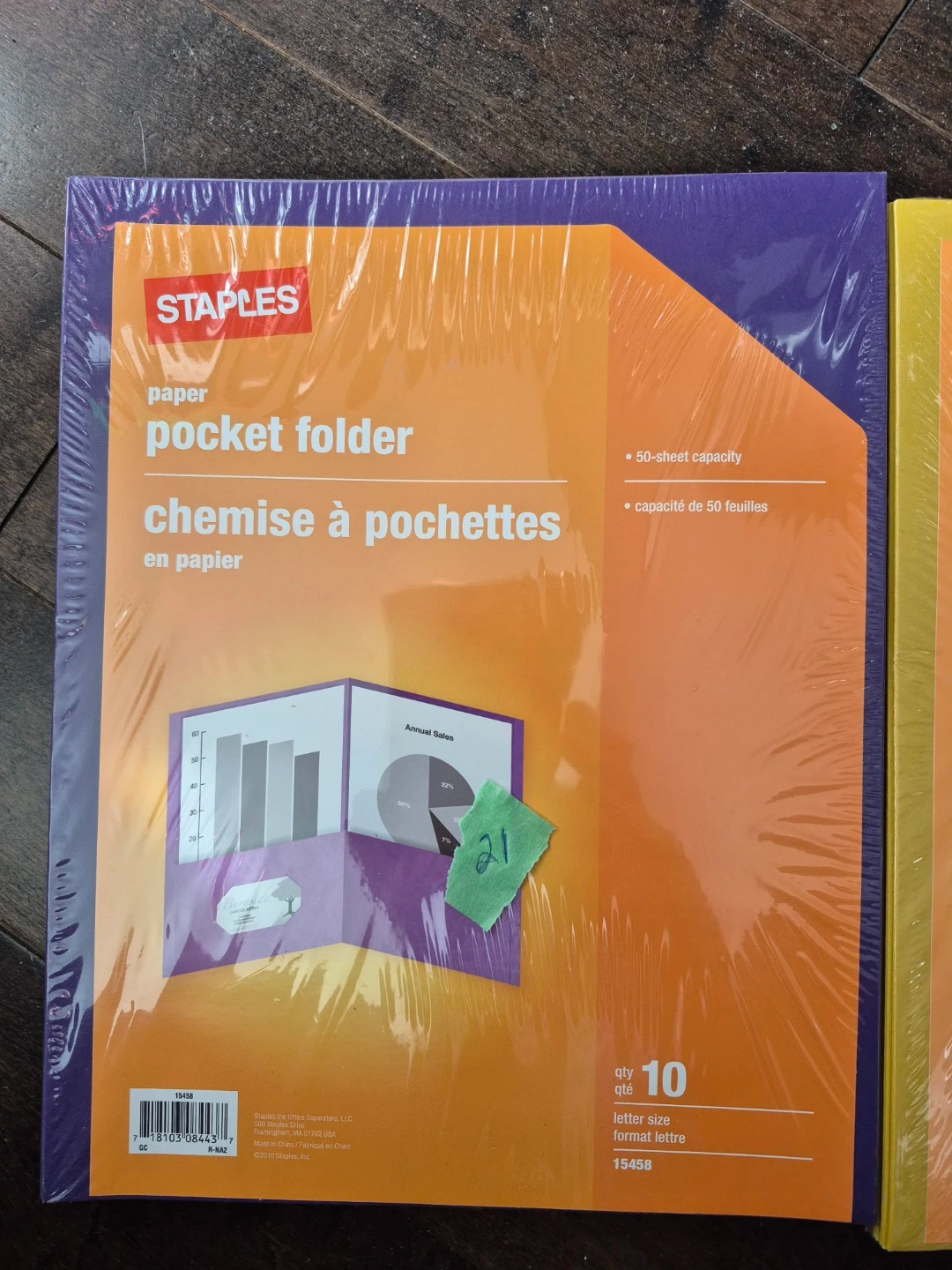 These are Staples paper pocket folders, sold as a 10-pack. Each folder holds up to 50 sheets of paper. They're letter size and perfect for organizing school or office papers.