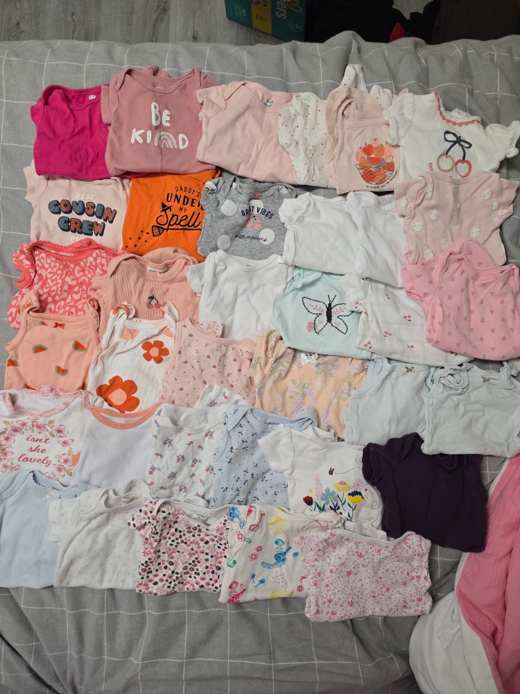 Selling a bundle of gently used baby clothes! There's a mix of onesies, pants, tops, and even a cozy sleep sack. All in good condition and ready for a new little one 0-3 mon ( newborn too)