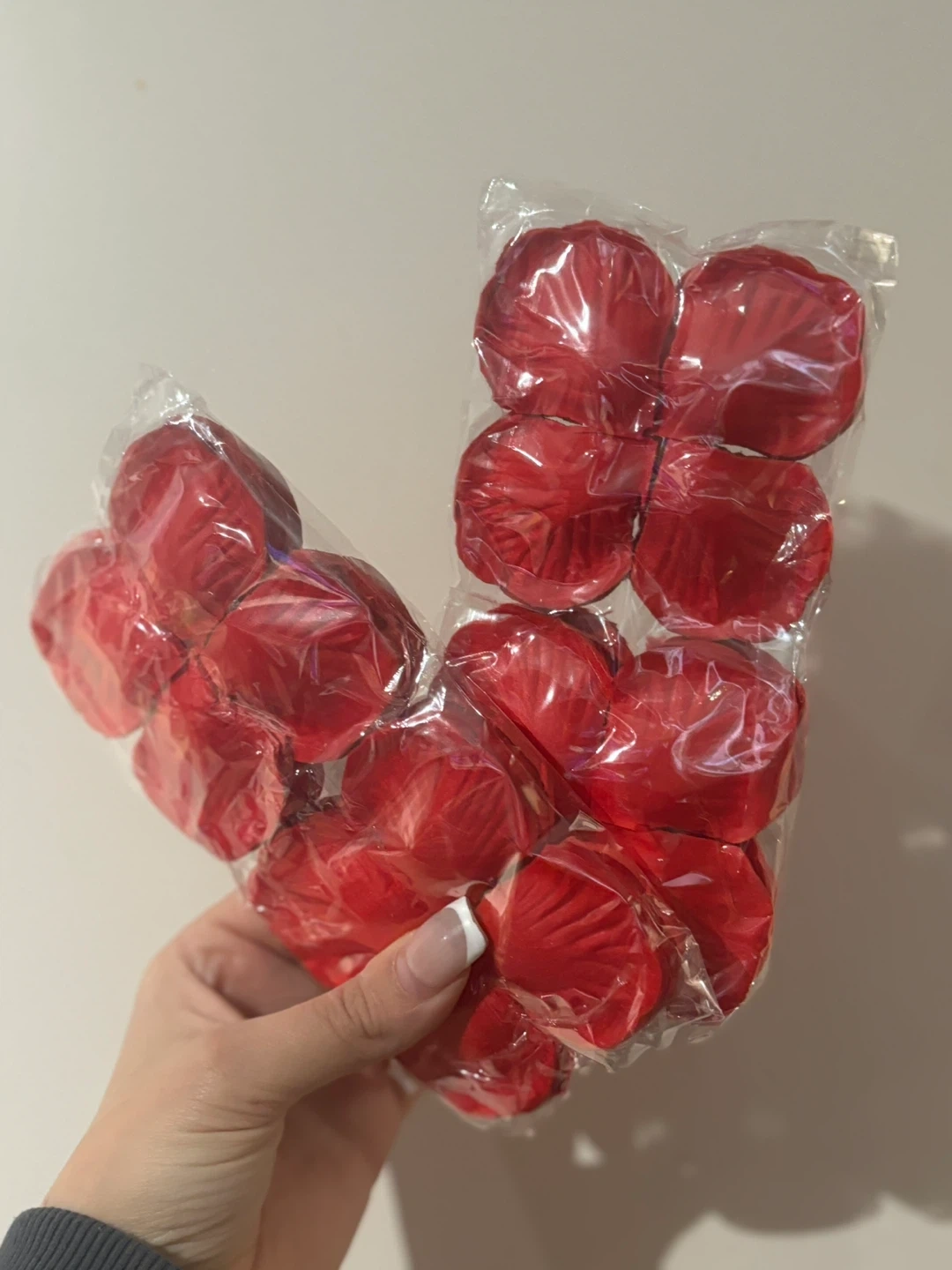 Bag of artificial red rose petals. These petals are made of fabric. They're great for decorations or events!