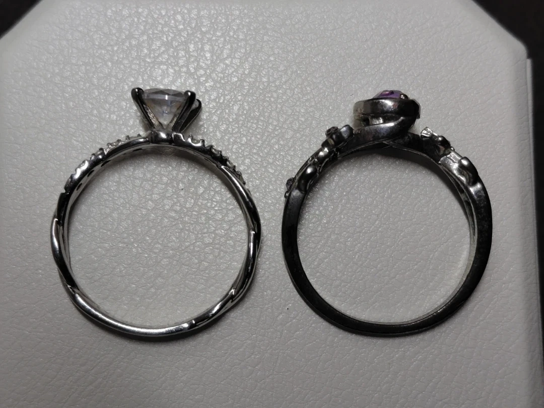 Selling a pair of fine costume jewerly rings. Size 10. One is quirurgical steel with a clear gemstone, and the other is silver with a pinkish-purple gemstone and a leafy design. They come in a nice box! - Open to offers