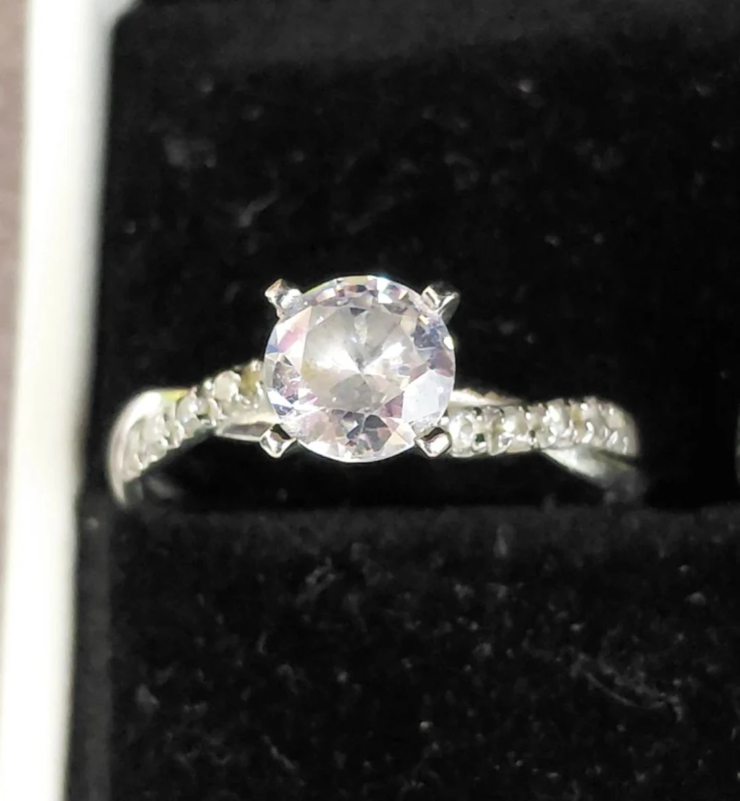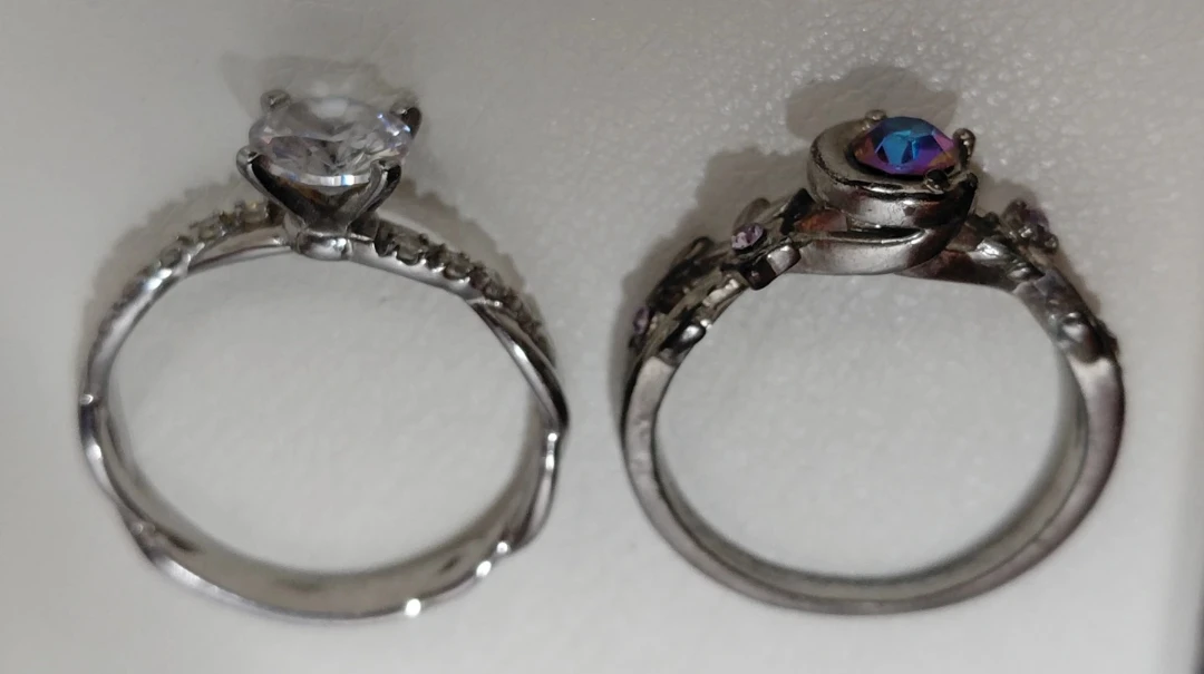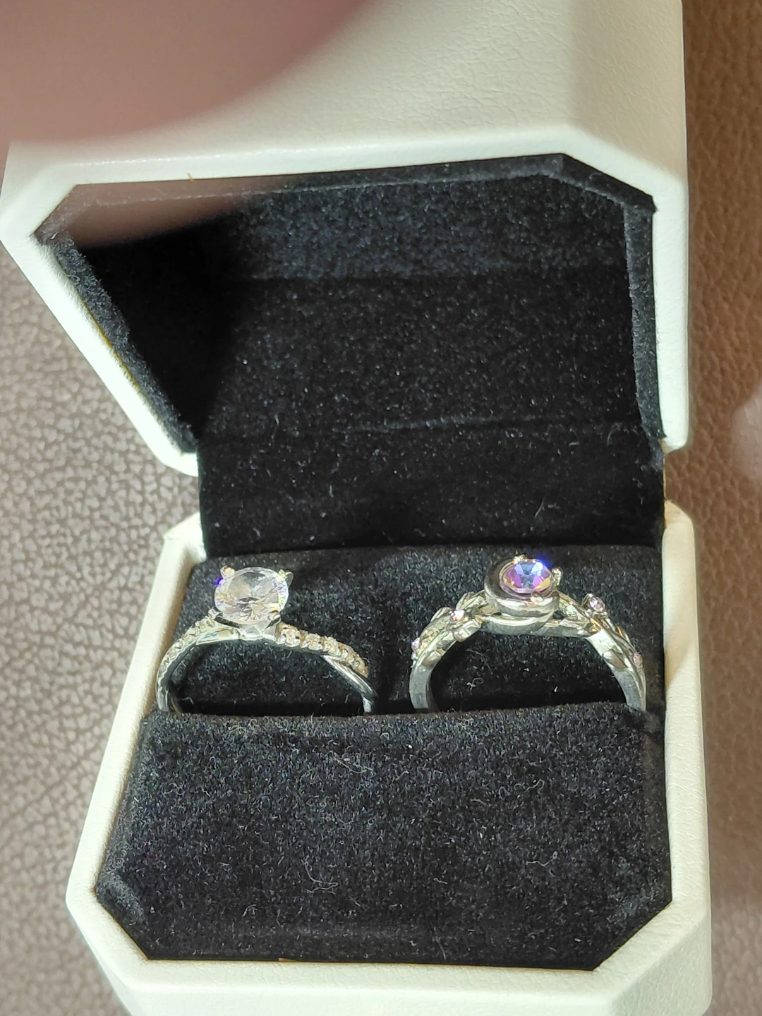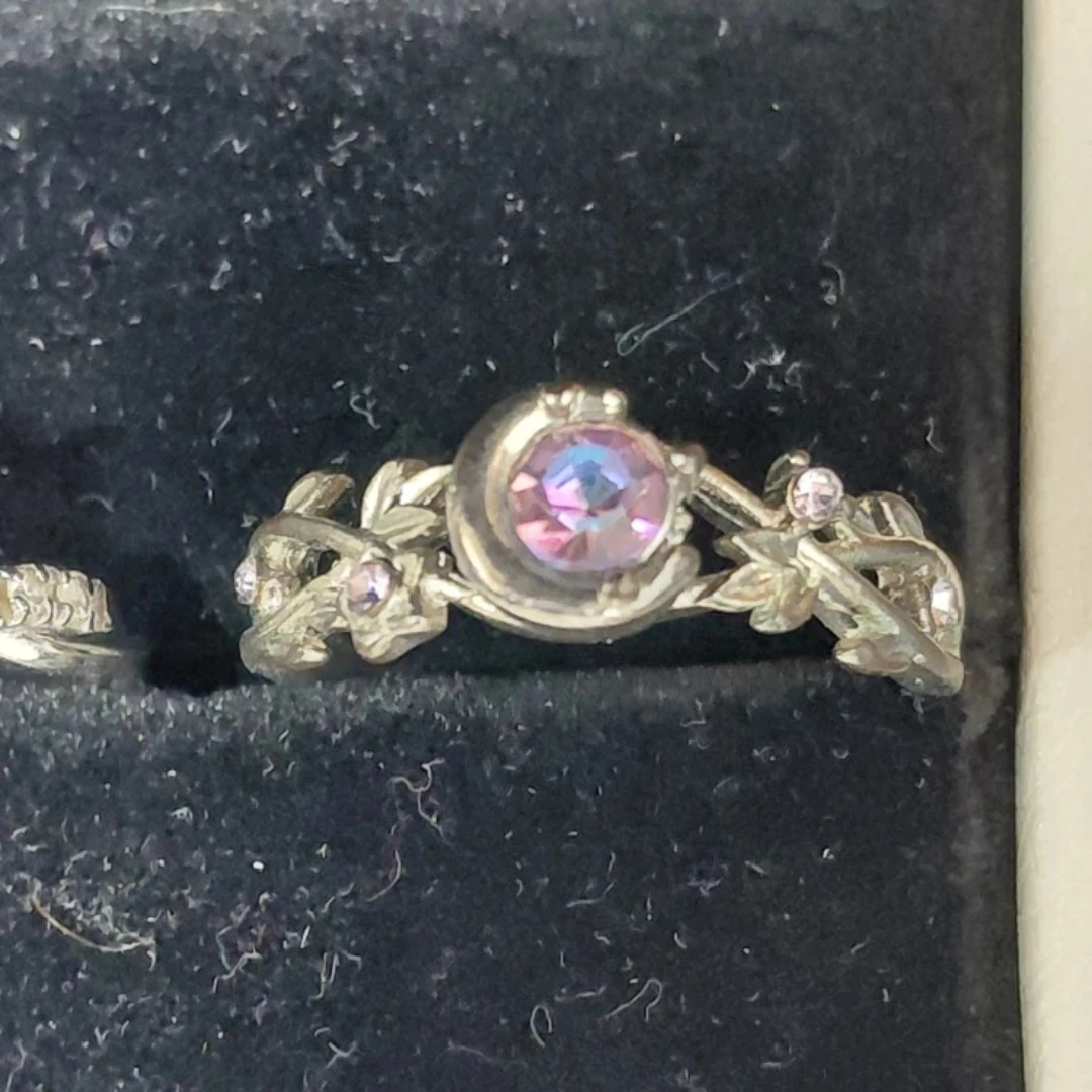 Selling a pair of fine costume jewerly rings. Size 10. One is quirurgical steel with a clear gemstone, and the other is silver with a pinkish-purple gemstone and a leafy design. They come in a nice box! - Open to offers