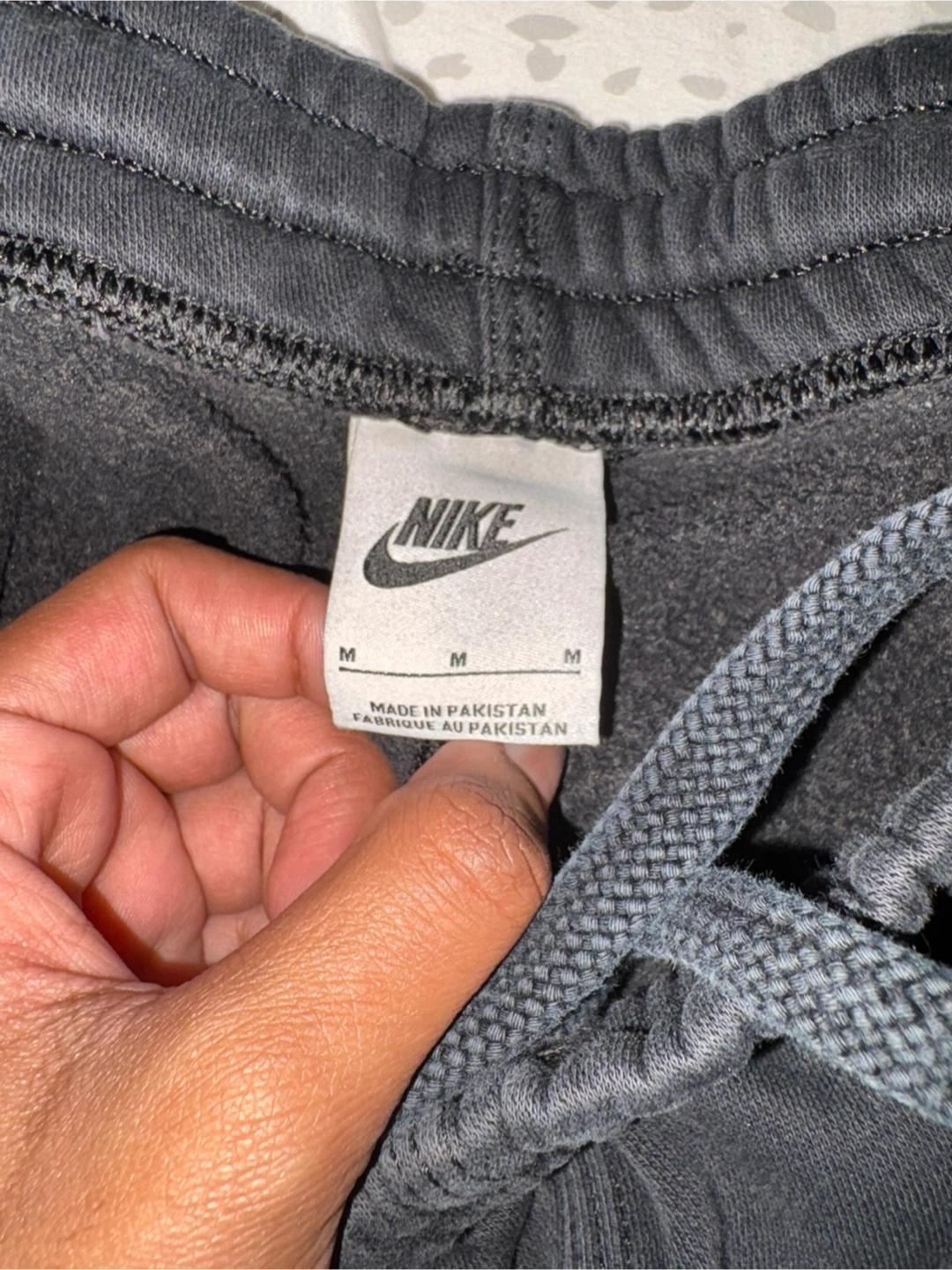 Grey Nike sweatpants with white swoosh logo. Made in Pakistan. Size Medium. These pants have a small tear on the right leg.