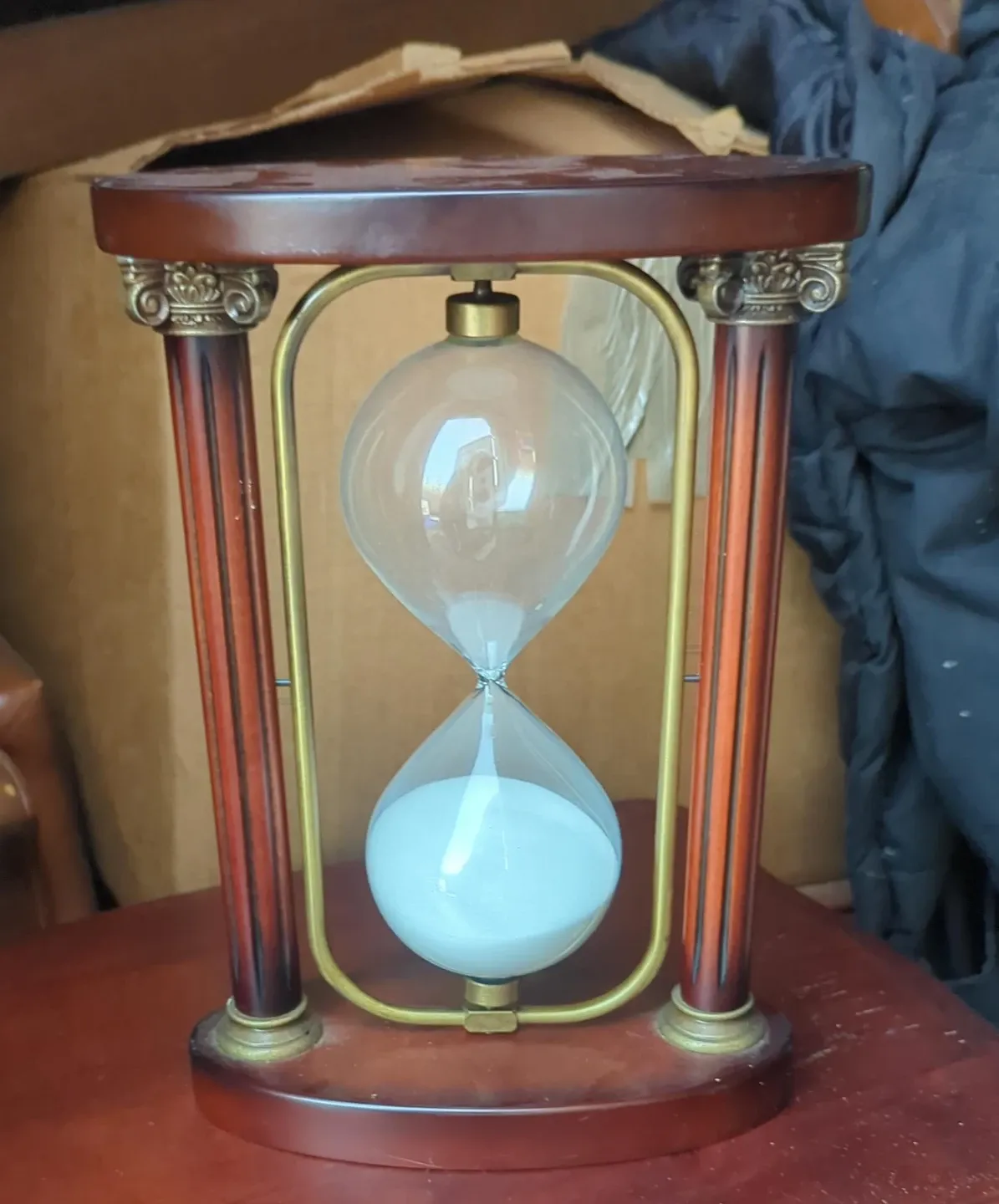 A decorative hourglass with a wood-finished base and pillars. It features a clear glass bulb filled with white sand. This timer would be a nice accent piece for a desk or shelf.