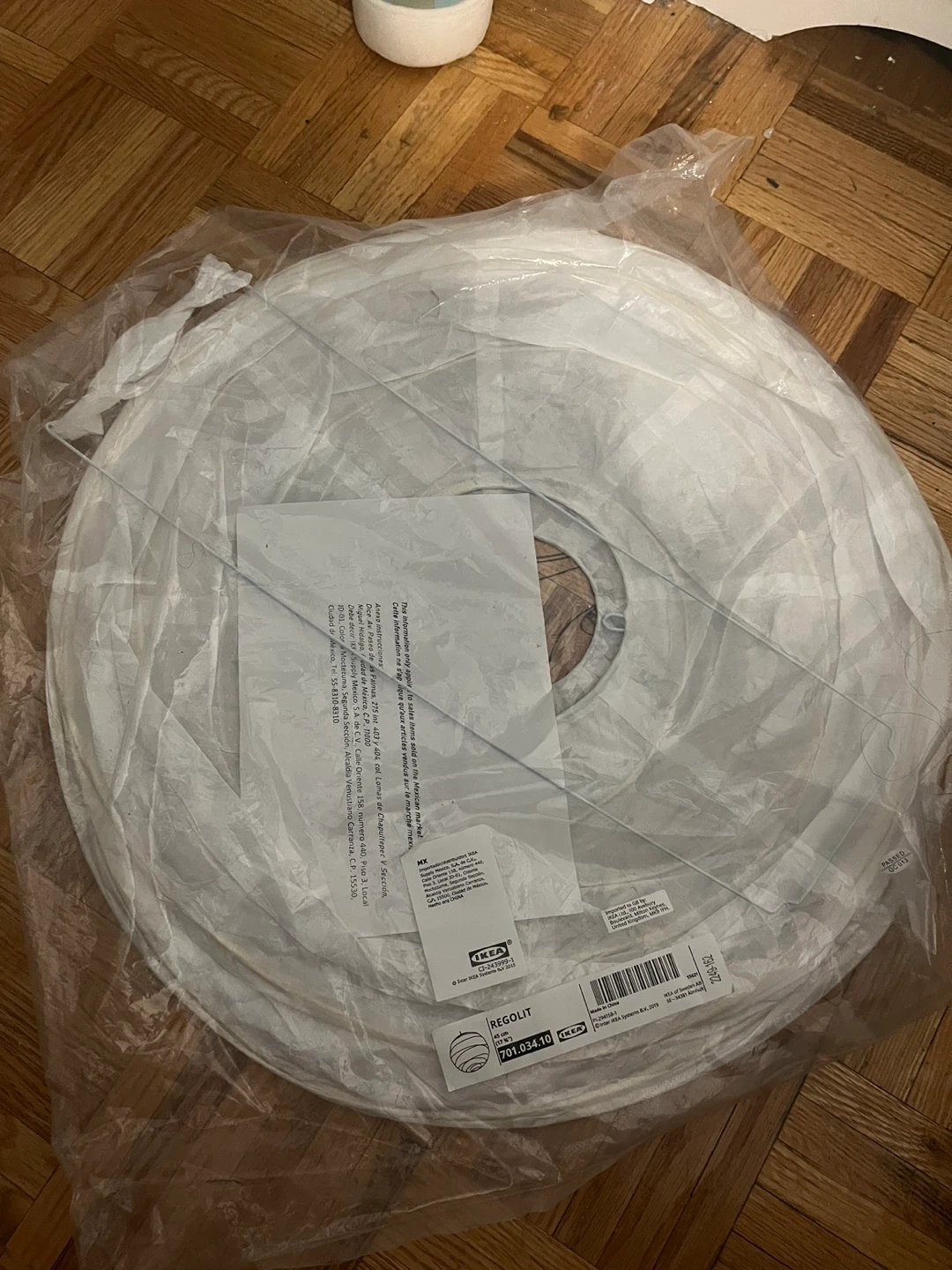 This is an IKEA REGOLIT pendant lamp shade. It's 45 cm in diameter. This shade is made of paper and provides a diffused, soft light.