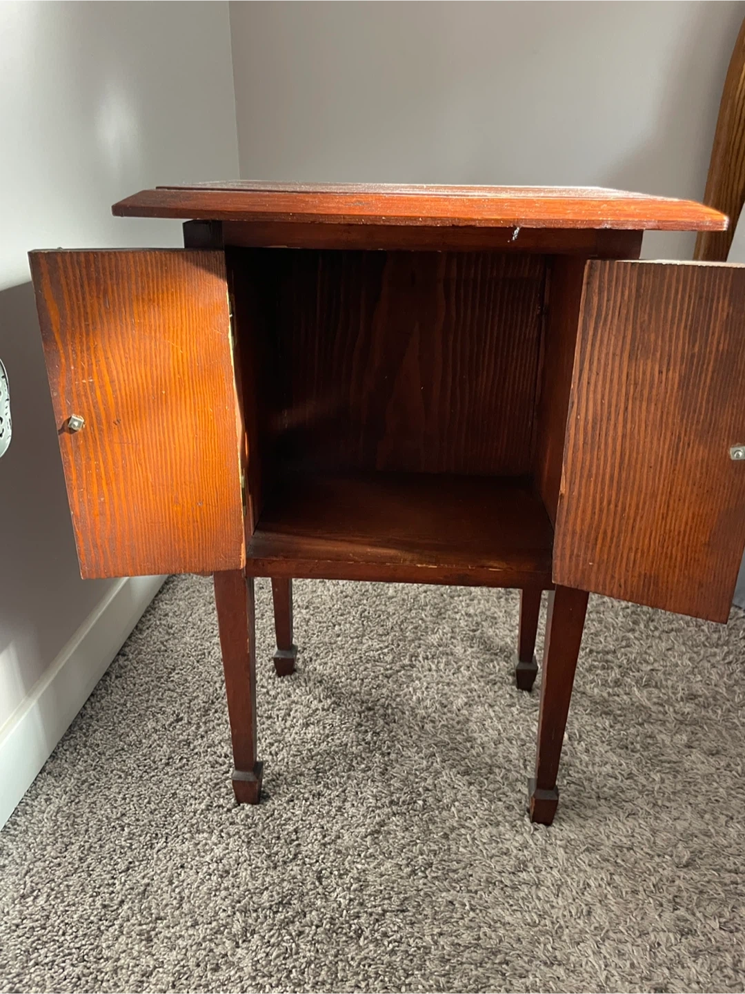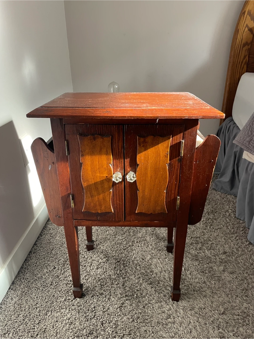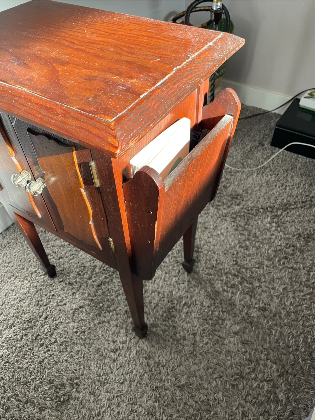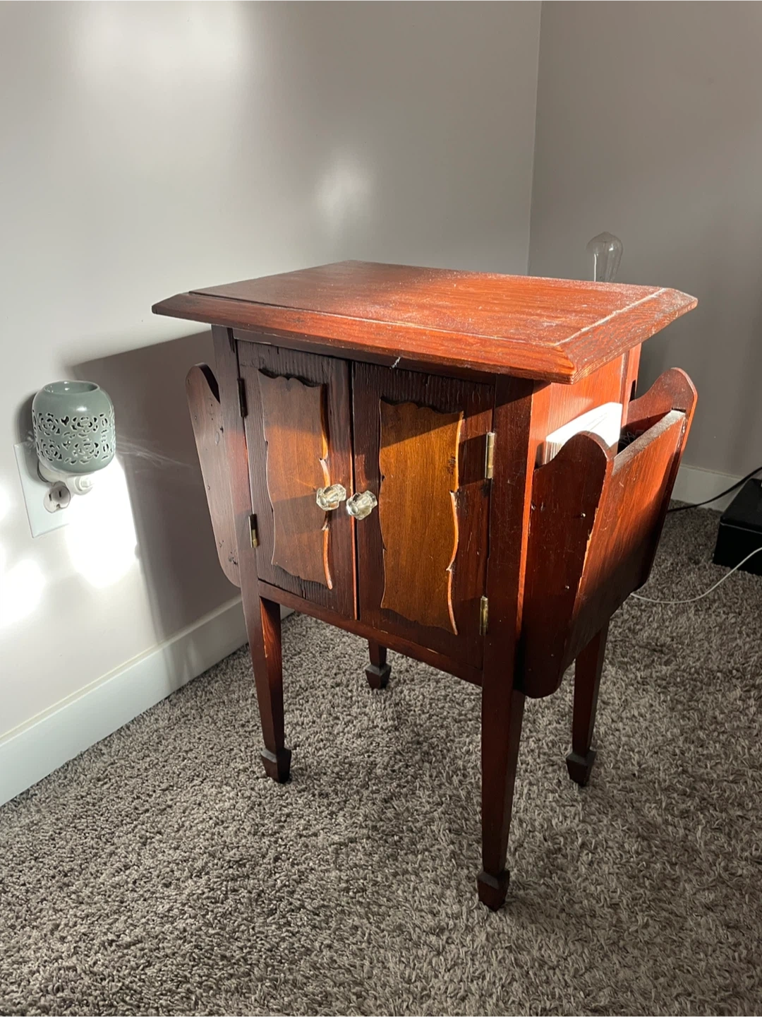 A wooden table with two side pockets for magazines and a small cabinet with two doors. Made of dark stained wood with clear knobs. A charming piece for holding reading materials and small items. Perfect for a cozy living room or as a bedside table!