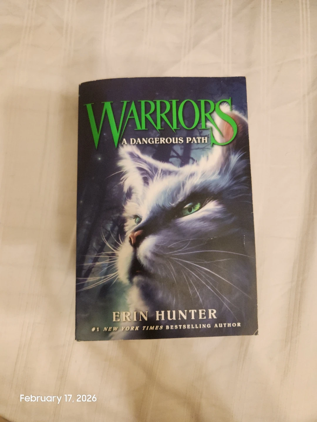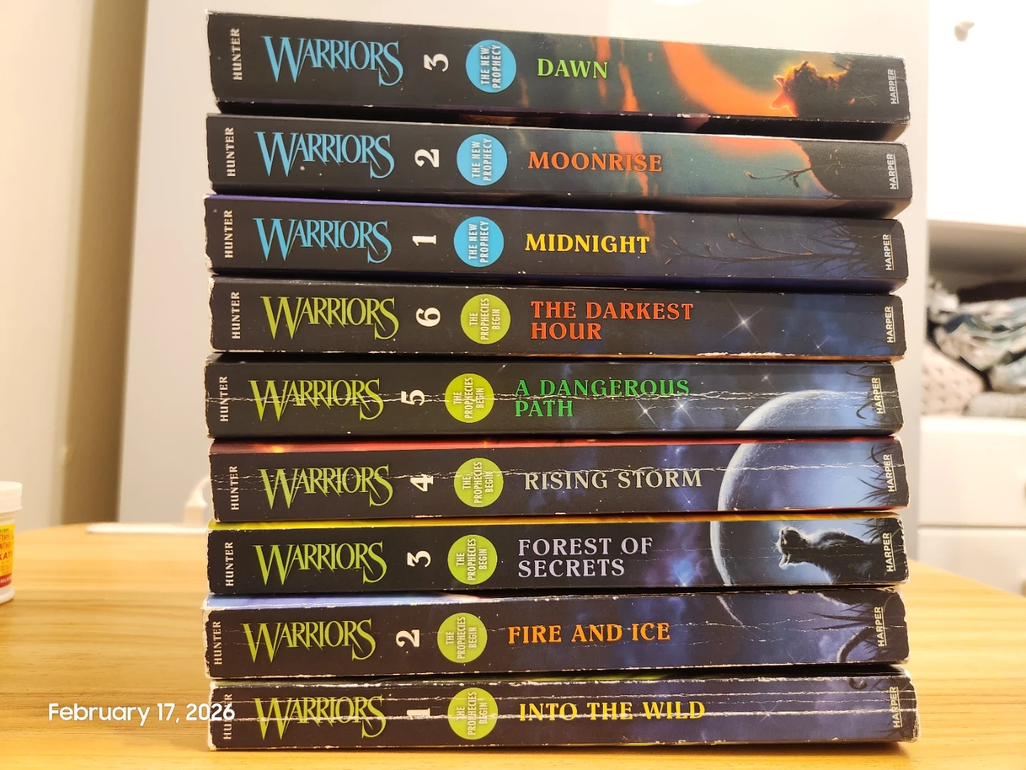 8$ each book or 70$ for the lot. This is a collection of 9 Warriors books by Erin Hunter. It includes 'Into the Wild', 'Fire and Ice', 'Forest of Secrets', 'Rising Storm', 'A Dangerous Path', 'The Darkest Hour', 'Midnight', 'Moonrise', and 'Dawn'. They're paperback editions. Some in rough condition.