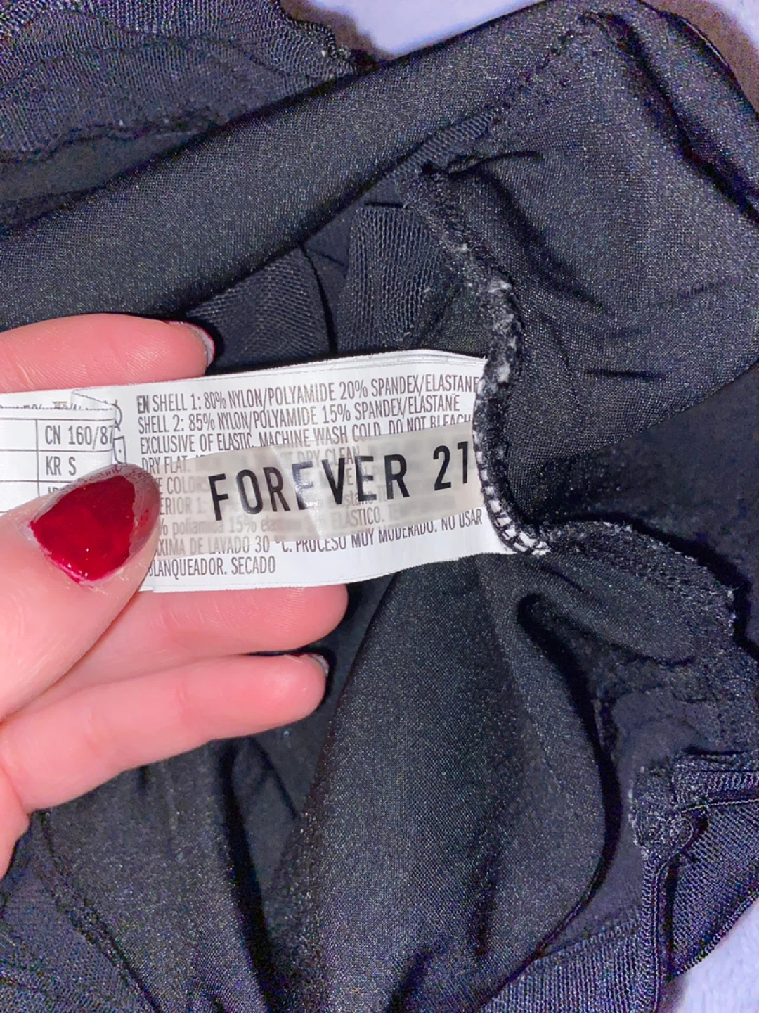 Here's a cute Forever 21 long sleeve SWIM top in black! It's a size small and made of 80% nylon/polyamide and 20% spandex/elastane for the shell, and 85% nylon/polyamide and 15% spandex/elastane for the lining
