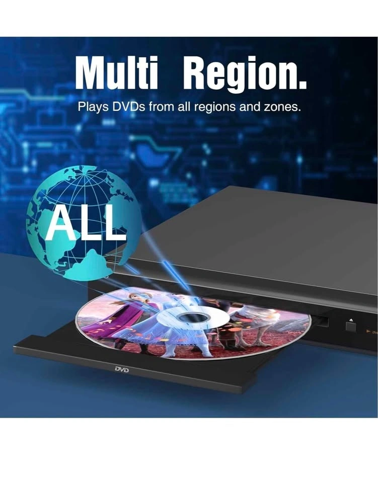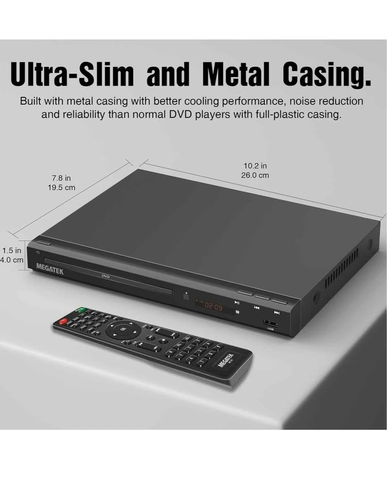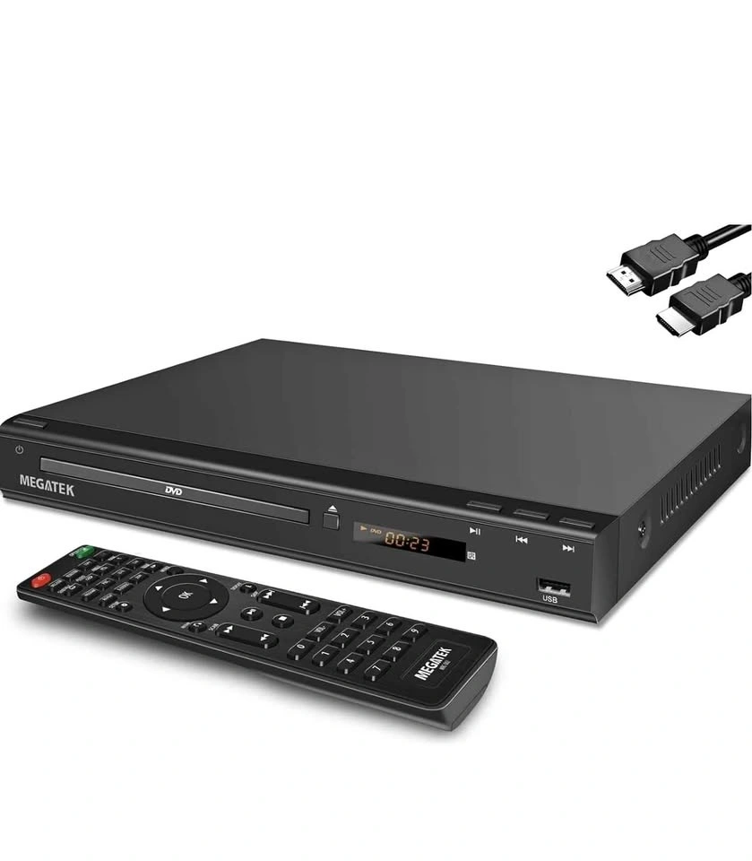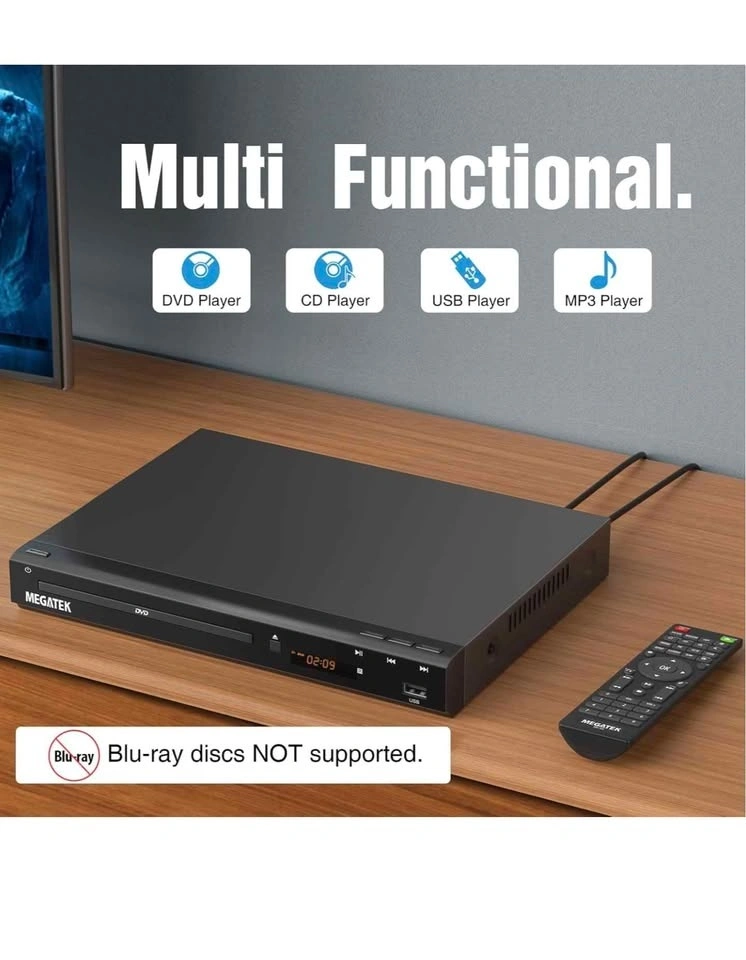 Versatile MEGATAK DVD player. Plays DVDs, CDs, USB media, and MP3s. It's multi-region so plays DVDs from all zones. Has 4K compatible and 1080P upscaling for a great picture. HDMI connection, progressive-scan, noise reduction, and anti-skip features too. Comes with remote and HDMI cables. No Blu-ray disc support.